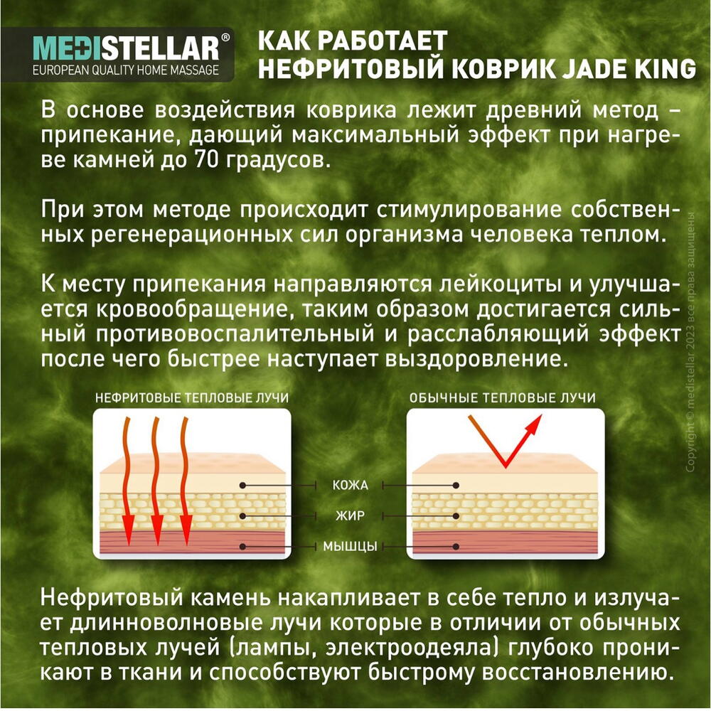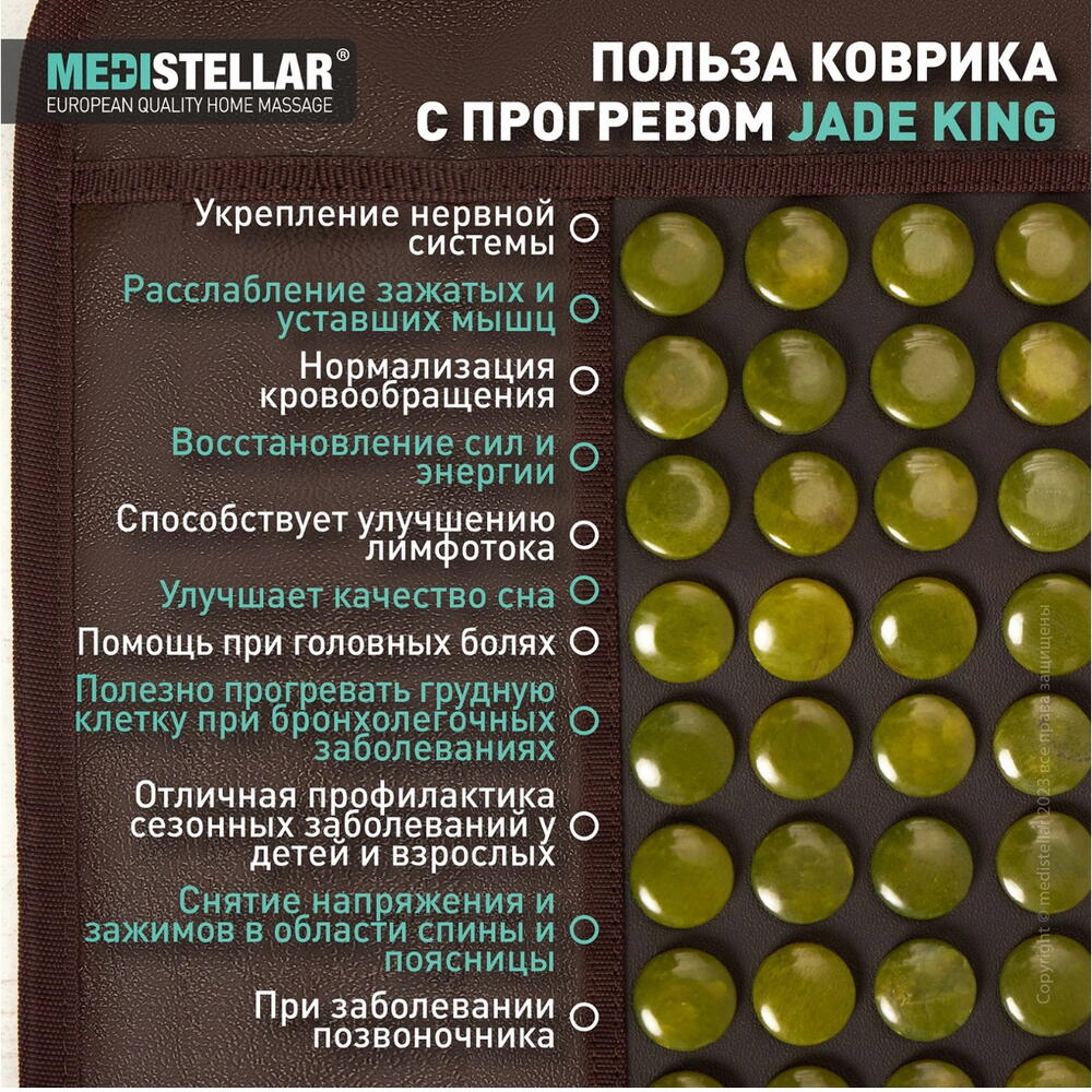 Прогревающий коврик с нефритовым камнем Jade King Погрузитесь в мир расслабления и благополучия с прогревающим ковриком Jade King. Этот коврик, оснащенный натуральными нефритовыми камнями, представляет собой совершенство тепловой терапии, создавая уют и комфорт, сравнимый с эффектом деревенской печи. • Расслабление и Снятие Усталости: Нежное тепло коврика эффективно расслабляет тело, помогая снять усталость и напряжение после напряженного дня. • Профилактика и Дополнение к Лечению Простуд: Тепло нефритовых камней отлично подходит для профилактики простудных заболеваний и может служить дополнением к их лечению, создавая ощущение тепла и уюта. • Улучшение Кровообращения: Регулярное использование коврика способствует улучшению кровообращения, благоприятно влияя на общее состояние здоровья. • Эффект Деревенской Печи: Тепло коврика напоминает приятное тепло деревенской печи, обеспечивает глубокое ощущение расслабления и комфорта  Прогревающий коврик Jade King - это не просто средство для расслабления, но и мощный инструмент для поддержания здоровья и благополучия, используя силу природы и тепла.