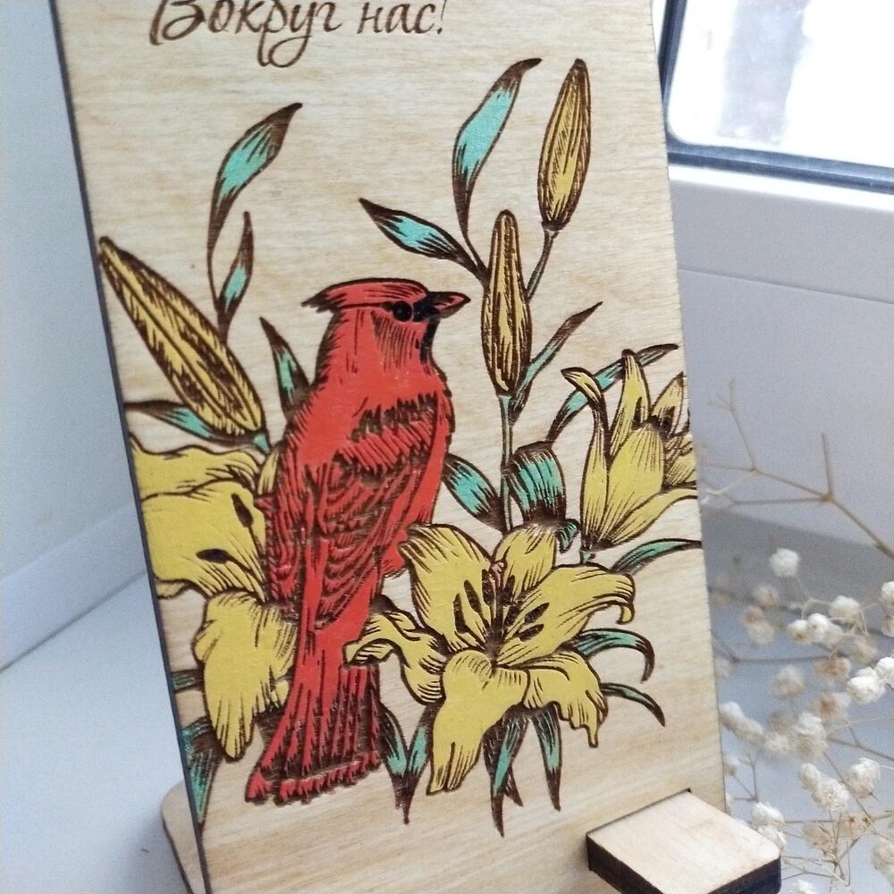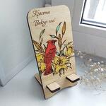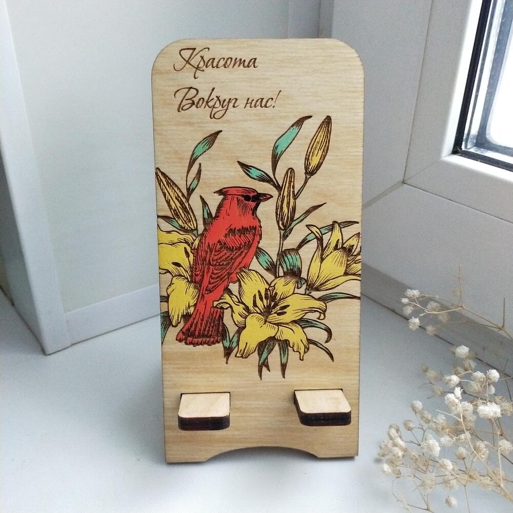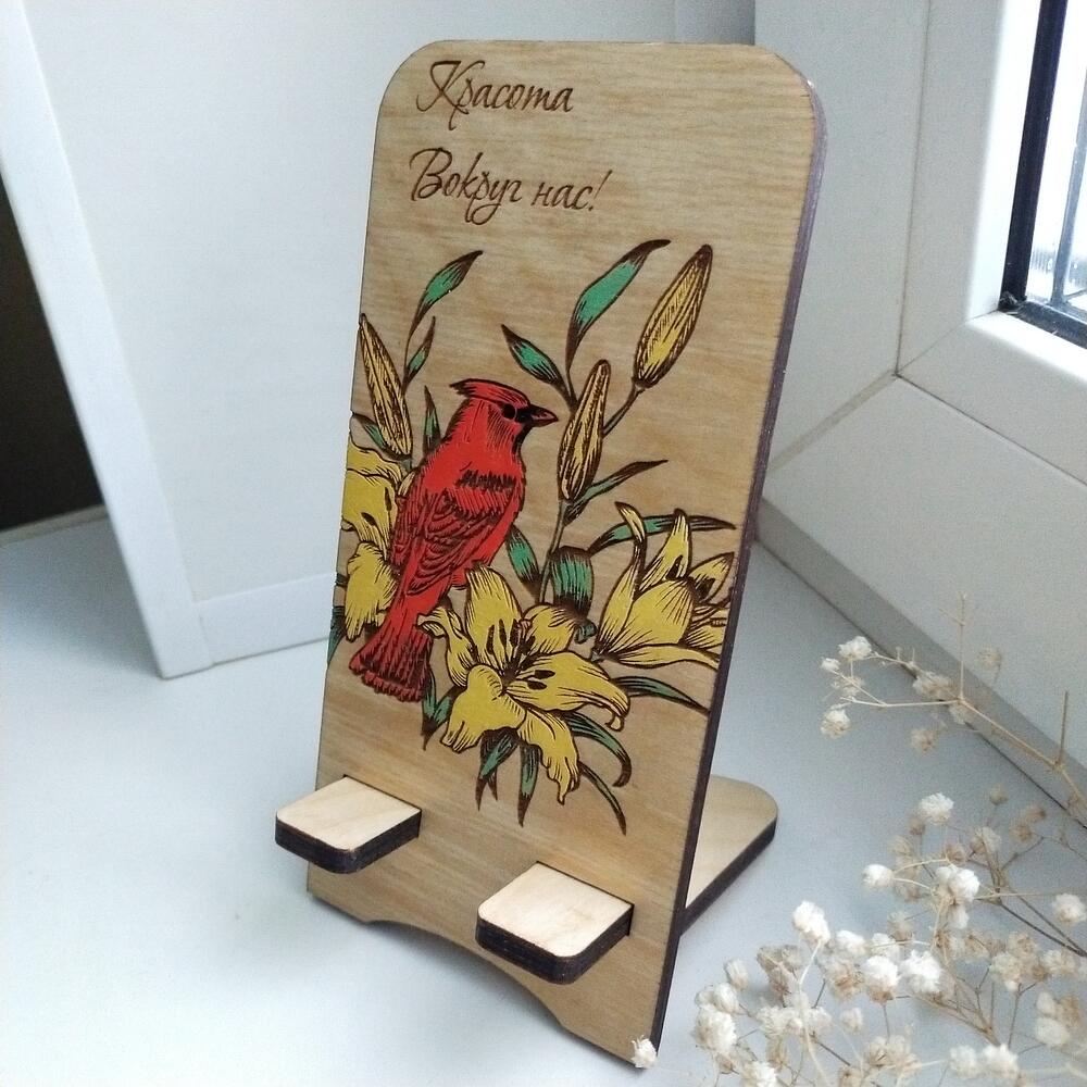 Оригинальная подставка для телефона из дерева ручной работы! На подставке изображены яркие жёлтые лилии и птица Кардинал. Телефон можно располагать вертикально или горизонтально.