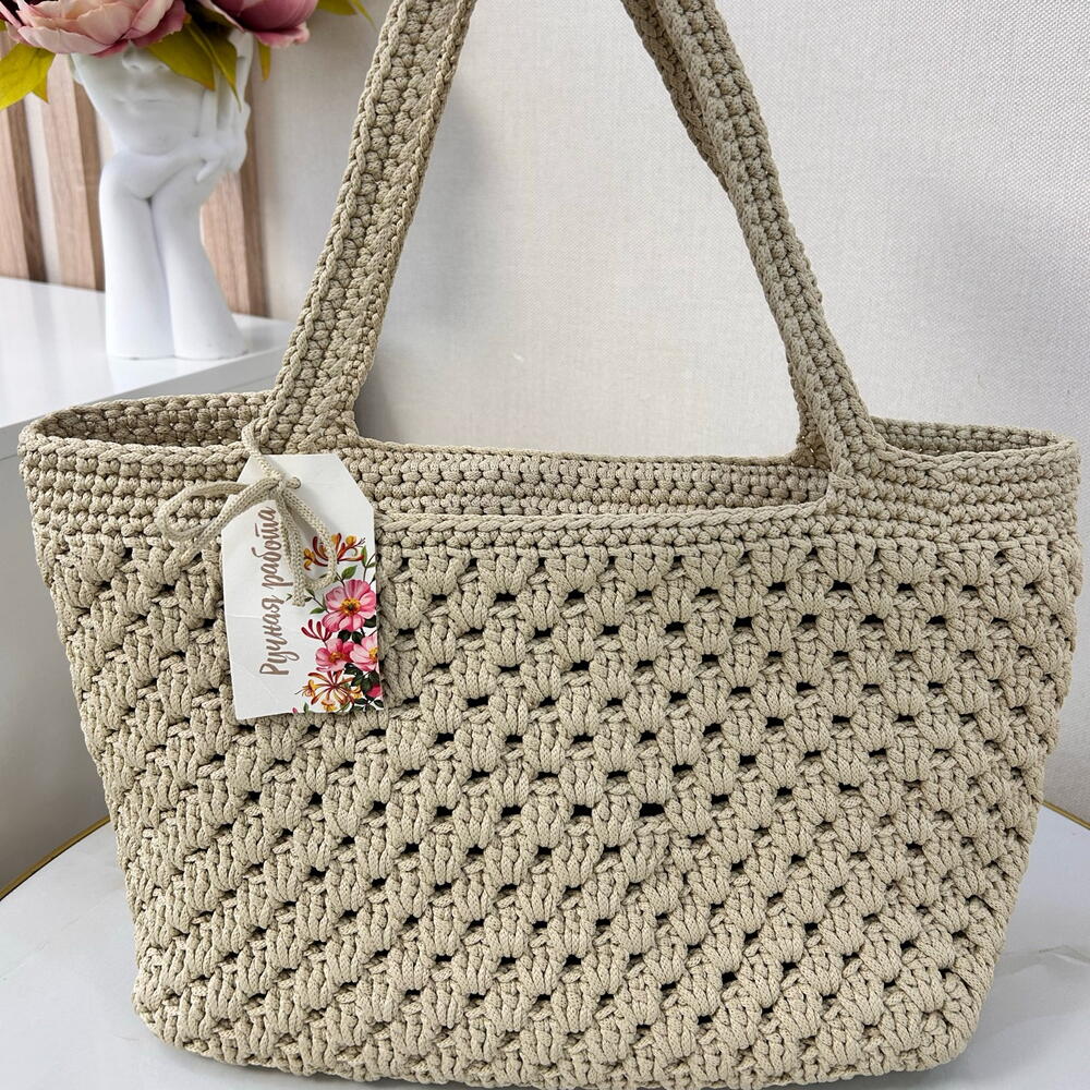 Предлагаем вашему вниманию сумку ручной работы, выполненную крючком из полиэфирного шнура! Крепкая, вместительный сумка, подходит для пляжа, шоппинга или для прогулок по городу! Также возможно выполнить изделие под ваш вкус и цвет, на заказ! Размеры сумки: Ширина 40 Высота 25 Дно сумки 30*12 Ручки 50 Размеры указаны в сантиметрах.
