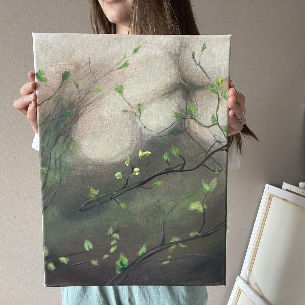 Описание картины: Пробуждение весны 30х40см Холст/масло 10.000₽ продается На этой картине, размером 30х40 см, нежно запечатлены тонкие веточки, на которых с трепетом распускаются свежие почки и первые листочки. Каждая деталь, выполненная в технике масла, словно наполнена живой энергией пробуждающейся природы. Легкость композиции отражает хрупкость и красоту моментов, когда земля начинает расправлять свои объятия после зимней стужи. Веточки, тонкие как мечты, обвивают пространство, создавая ощущение невидимой связи между небом и землей. Эта работа пронизана атмосферой нежности, возвещающей о начале нового жизненного цикла, о каждом новом листочке, как о символе надежды и обновления. Она приглашает зрителя остановиться и насладиться красотой мгновения, когда природа вновь начинает жить, наполняя мир яркими красками и свежими звуками. Пробуждение весны — это не просто картина, это поток свежего воздуха и тепло первых солнечных лучей, которые пробивают ледяную корку и питают землю. Она станет ярким акцентом в вашем интерьере, напоминая о том, что жизнь всегда находит способ возродиться.