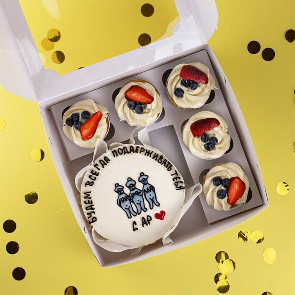 Бенто-торт и 5 капкейков в одной коробке в подарок вашим близким. На выбор 6 вкусов бенто-торта и 4 вкуса капкейков. Напишите о выбранных начинках в чате или мы приготовим десерты с начинкой, указанной в составе - красный бархат.