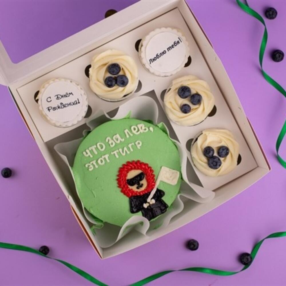 Бенто-торт и 5 капкейков в одной коробке в подарок вашим близким. На выбор 6 вкусов бенто-торта и 4 вкуса капкейков. Напишите о выбранных начинках в чате или мы приготовим десерты с начинкой, указанной в составе - красный бархат. Также вы можете внести следующие изменения в дизайн десертов - цвет, текст надписи.