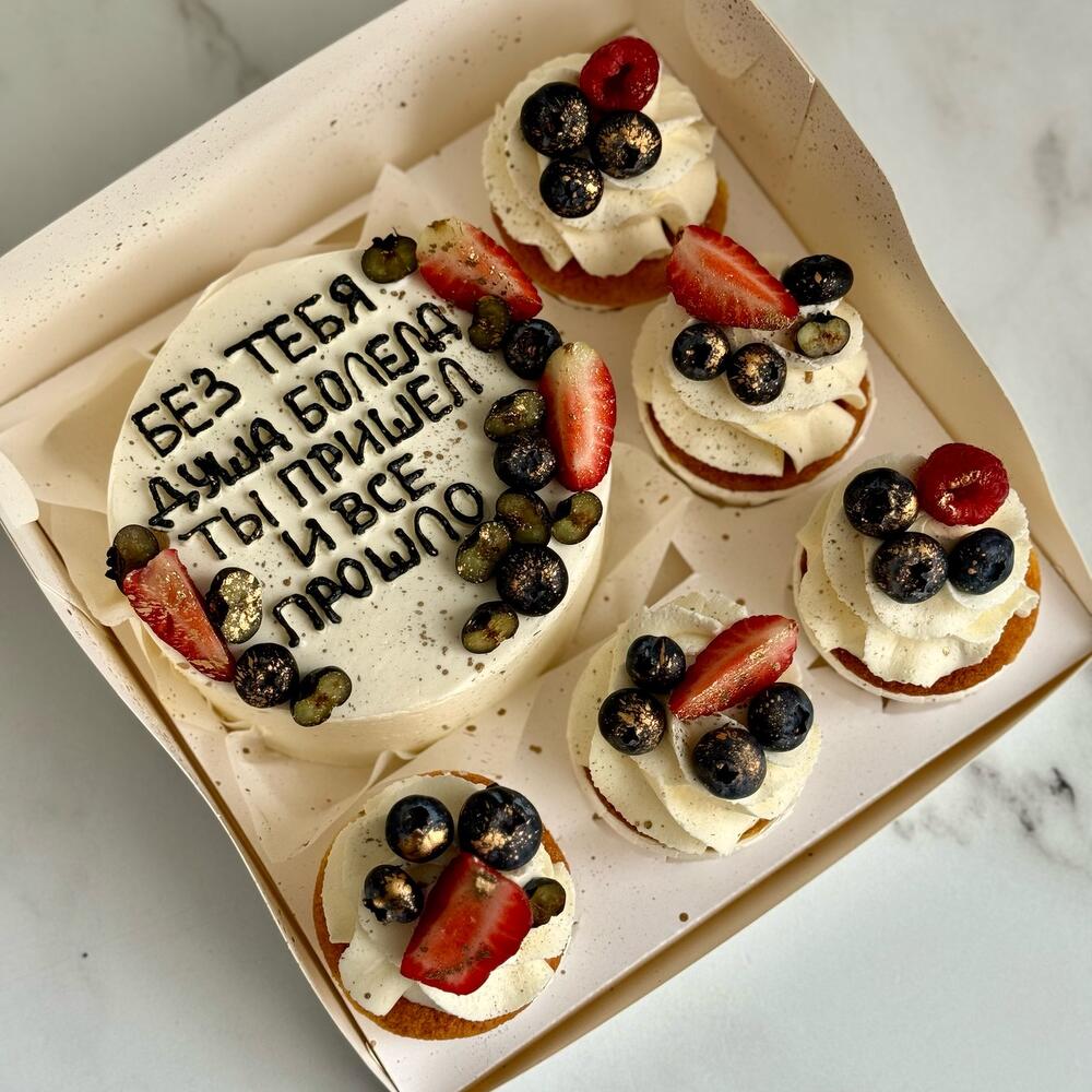 Набор из бенто торта и 5 капкейков🎁 В стоимость включен декор - надпись и небольшой рисунок на бенто торте, ягоды. Бенто торт весом 500 г, такого размера достаточно для 2 человек. Пожелания по декору пишите в комментарии к заказу или сообщения, ваш декор рассчитывается индивидуально🤍 Начинку можете выбрать как дополнительный товар, начинка по умолчанию шоколад вишня.
