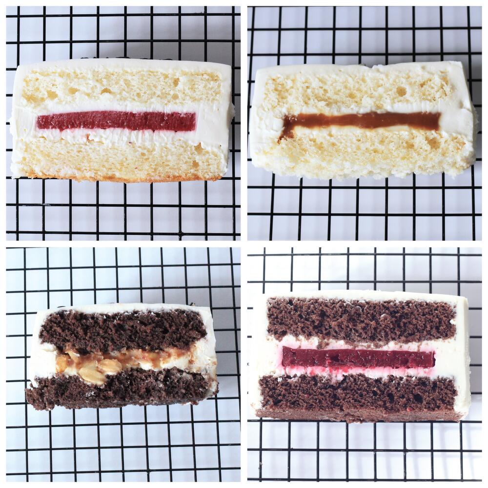 Ванильный бисквит: мука пшеничная, разрыхлитель теста, яйцо куриное, сахар, ванильный сахар, молоко, масло растительное. Шоколадный бисквит: мука пшеничная, разрыхлитель теста, какао, яйцо куриное, сахар, молоко, масло растительное. Ягодная начинка — ягода замороженная (клубника/вишня), сахар, пектин. Карамель — сахар, глюкозный сироп, сливки 33%, масло сливочное 82,5%. Крем-чиз — сливочно-творожный сыр, сливки 33%, сахарная пудра.