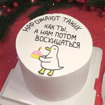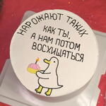 Оригинальный бенто-торт с минималистичным дизайном Украшен изображением милого утёнка с кексиком в лапках и вдохновляющей надписью: „Нарожают таких, как ты, а нам потом восхищаться“. Идеальный выбор для весёлого дня рождения! ✨ Подарочная упаковка торта: премиальная коробка с прозрачным куполом, атласная лента, мини открытка, конфетти, свечка и бумажный подарочный пакет