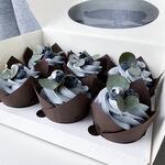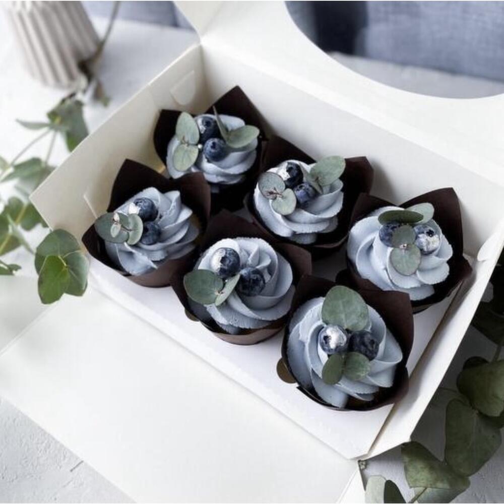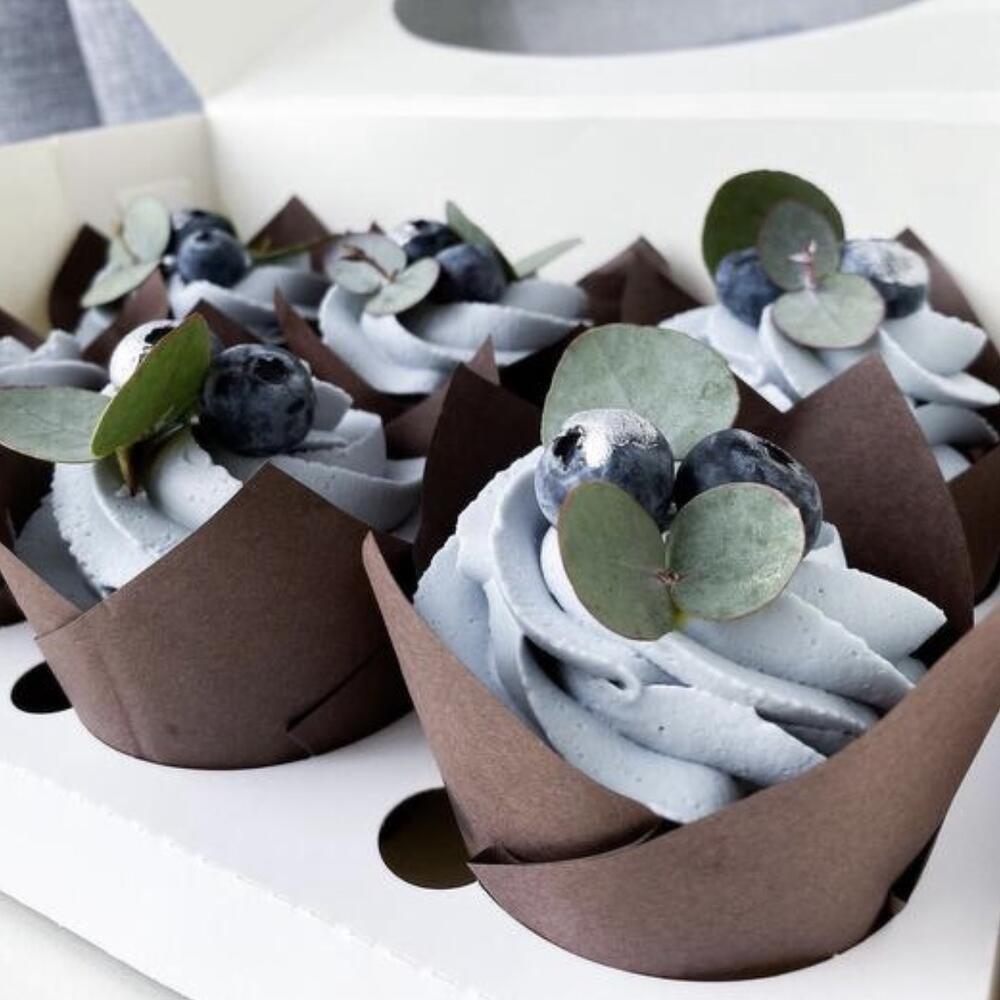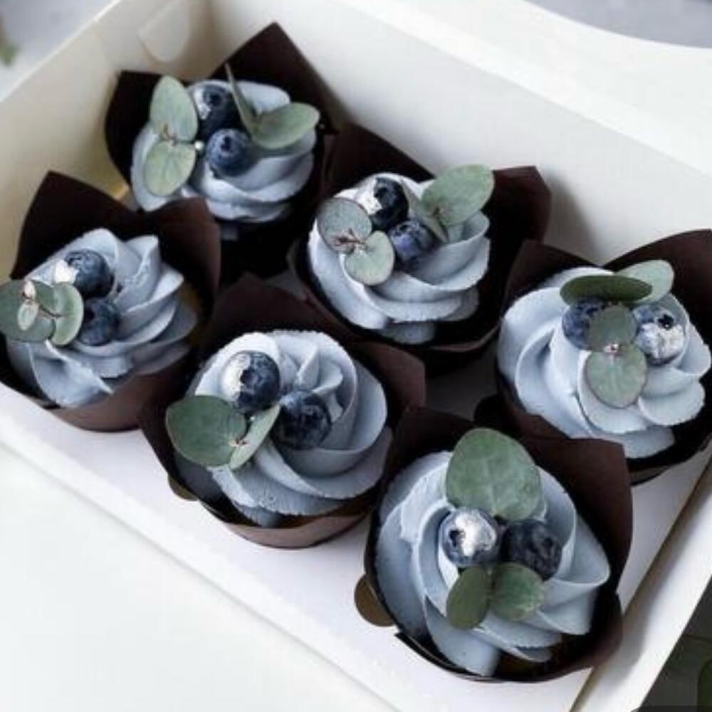 Шоколадны капкейки снежным крем чиз,нежно голубова цвета. Внутри  карамельная начинка. Украшен с ягодами(голубика)