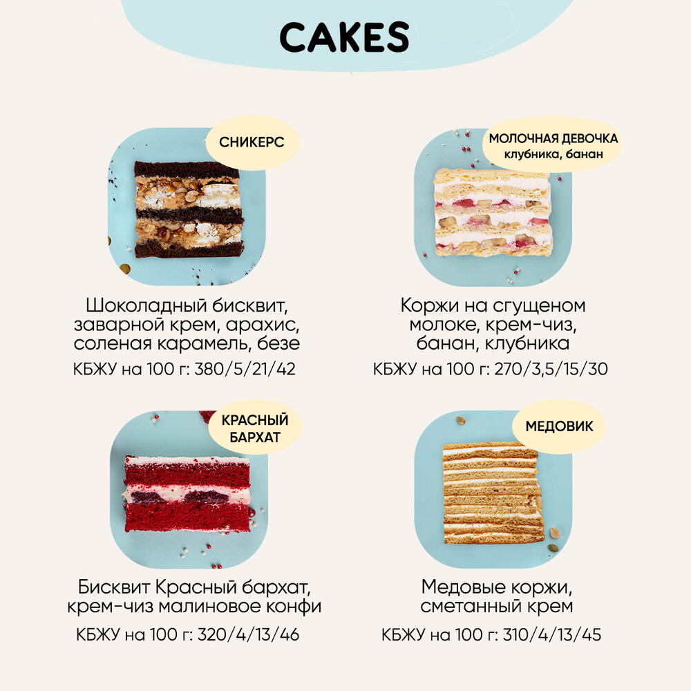 Мука пшен. вс, яйцо, сахар, какао-порошок, масло сливочное, вареная сгущенка, завар. крем (молоко, сахар, яйцо, ванилин, крахмал кукур., мука), соус карамельный (сахар, сливки 35%, масло сливочное), безе, арахис, сыр творожный, краситель пищ.