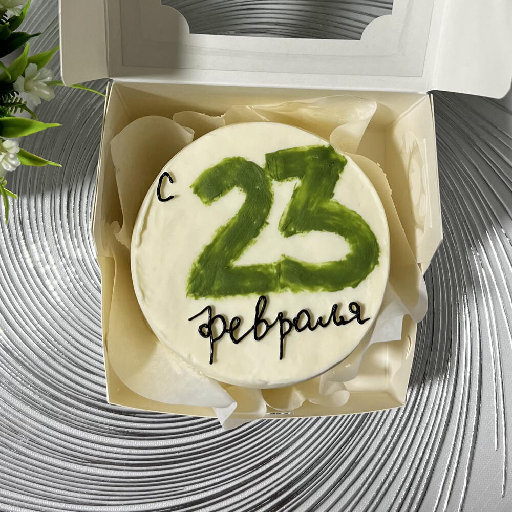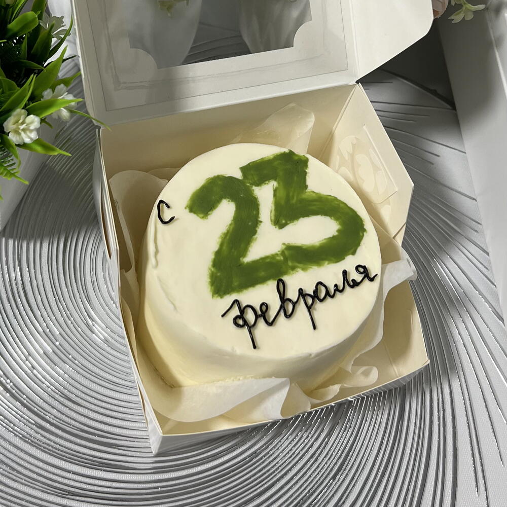 Праздничный торт весом 450 грамм в лаконичном стиле 🤍 Торт покрыт гладким белым кремом с аккуратной бархатистой поверхностью. Верх украшен крупной цифрой «23», выполненной в выразительном зелёном оттенке, и изящной надписью «февраля» в чёрном цвете. Контраст цветов придаёт десерту яркость и тематичность, сохраняя при этом минимализм в оформлении. Идеальный вариант для персонального подарка или уютного поздравления к 23 февраля. Компактный размер отлично подойдёт для небольшого праздника или сладкого комплимента.