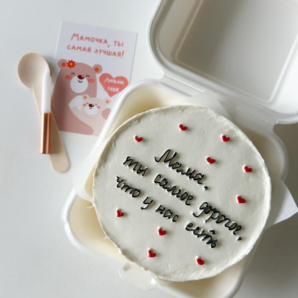 Бенто торт в подарок маме на День матери станет отличным сюрпризом🤍 Начинка на выбор (по умолчанию идет ваниль/клубника): 1. Ваниль/клубника или черная смородина : ванильные бисквиты, кремчиз , клубничная начинка или из черной смородины 2. Шоколад/карамель арахис или вишня: шоколадные бисквиты, кремчиз, карамель арахис/вишня Бенто-тортик упакован в белый ланч-бокс с деревянной ложечкой, свечкой и мини-открыткой. Получатель получит подарок в прозрачном пакете, с атласной лентой и конфетти🤍 Срок годности 72 ч С заботой, VolkPie