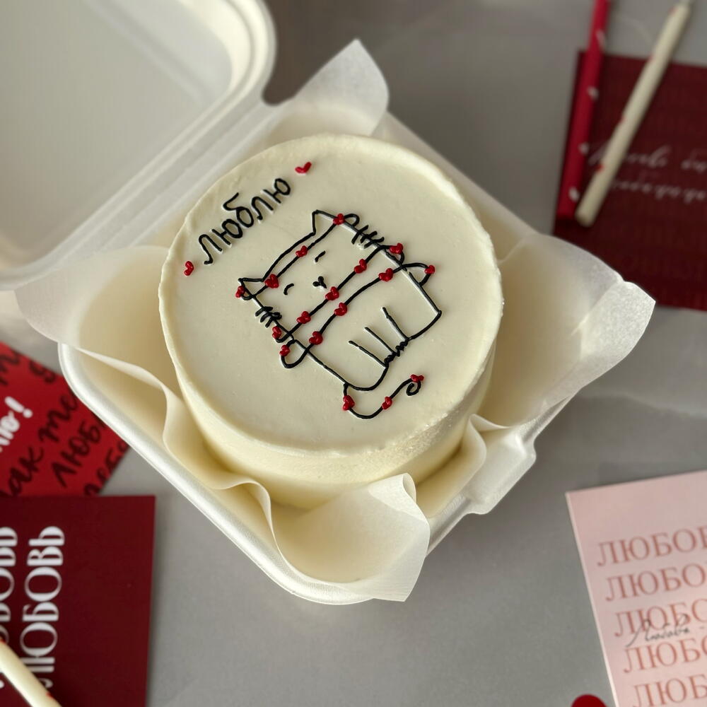 Бенто-торт «Люблю» с котом-валентинкой Когда хочешь сказать «люблю», но твоё чувство такое же яркое и милое, как этот кот в гирлянде🥹 Мини-торт для большого признания. Сладкий, компактный и очень душевный — для тех, кто ценит трогательные детали и обожает котиков❤️🙈