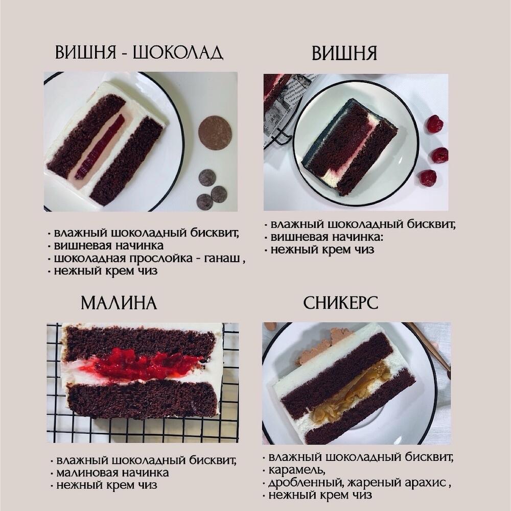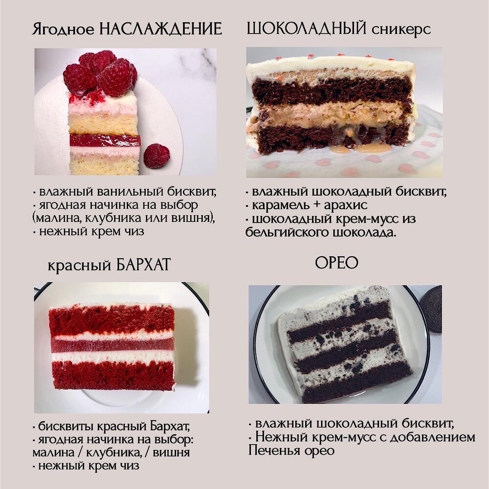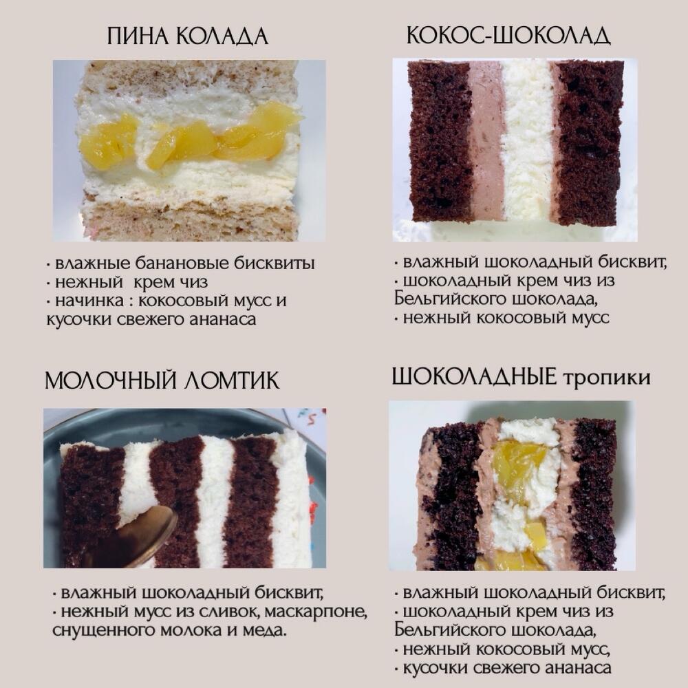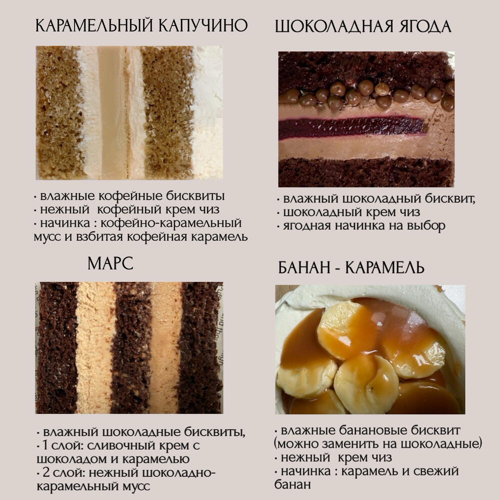 На Ваш выбор 17 начинок Каждая из начинок подробно описана в карточке товара. Бисквиты ШОКОЛАДНЫЙ БИСКВИТ: мука • какао • Сахар • сода • разрыхлитель • соль • яйцо • растительное масло • молоко • ванильная паста ВАНИЛЬНЫЙ БИСКВИТ: мука • Сахар • яйца • разрыхлитель • ванильная паста • растительное масло БИСКВИТ КРАСНЫЙ БАРХАТ: яйца • Сахар • масло растительное • мука • сода • разрыхлитель • кефир • какао • краситель пищевой красного цвета БАНАНОВЫЙ БИСКВИТ: яйца • Сахар • мука • кукурузный крахмал • разрыхлитель • банан • растительное масло КОФЕЙНЫЙ БИСКВИТ: мука пшеничная • мука миндальная • Сахар • яйцо • сливочное масло 82.5% • разрыхлитель • кофе растворимый • сливки 33% Крема КРЕМ ЧИЗ: творожный сыр • сливки • сахарная пудра (в шоколадной версии добавляется бельгийский шоколад и какао) КРЕМ МУСС ОРЕО: молоко • печенье орео • сливочный сыр • сливки • сахарная пудра • желатин ШОКОЛАДНЫЙ КРЕМ МУСС СНИКЕРС : молоко • сливки 33% • бельгийский шоколад • желатин КРЕМ МУСС МОЛОЧНЫЙ ЛОМТИК: маскарпоне • сливки 33% • сгущеное молоко • мед • желатин КОФЕЙНЫЙ КРЕМ ЧИЗ: творожный сыр • сахарная пудра • сливки 33% • кофейная карамель Начинки ЯГОДНЫЕ КОНФИ: малина, клубника или вишня • Пектин (натуральный загуститель) • Сахар. Ягодные или фруктовые начинки в тортах это - конфи или компоте, то есть термически обработанные, пюрированные фрукты или ягоды. Только такие начинки безопасны и пригодны к хранению. КАРАМЕЛЬ: Сахар • вода • сливки 33% • сливочное масло • глюкозный сироп • арахис ГАНАШ: 100% натуральный бельгийский шоколад • сливки 33% КОКОСОВЫЙ МУСС: кокосовое пюре, белый шоколад, сливки 33%, кокосовая стружка, желатин КАРАМЕЛЬНО-КОФЕЙНЫЙ МУСС: сливки 33% • кофе растворимый • желатин • кофейная карамель • сахарная пудра ВЗБИТАЯ КОФЕЙНАЯ КАРАМЕЛЬ: Сахар • глюкозный сироп • сливки 33% • масло сливочное 82,5% • кофе растворимый