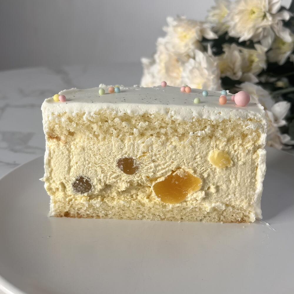 Манго-маракуйя: Мука, сахар, яйца, масло растительное, сметана, пюре манго, пюре маракуйи, сливки 33%, желатин