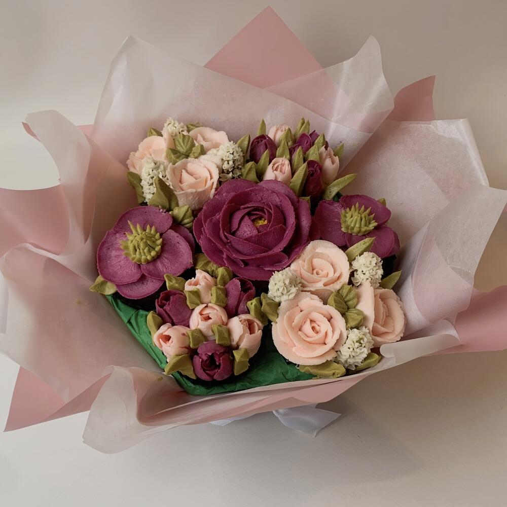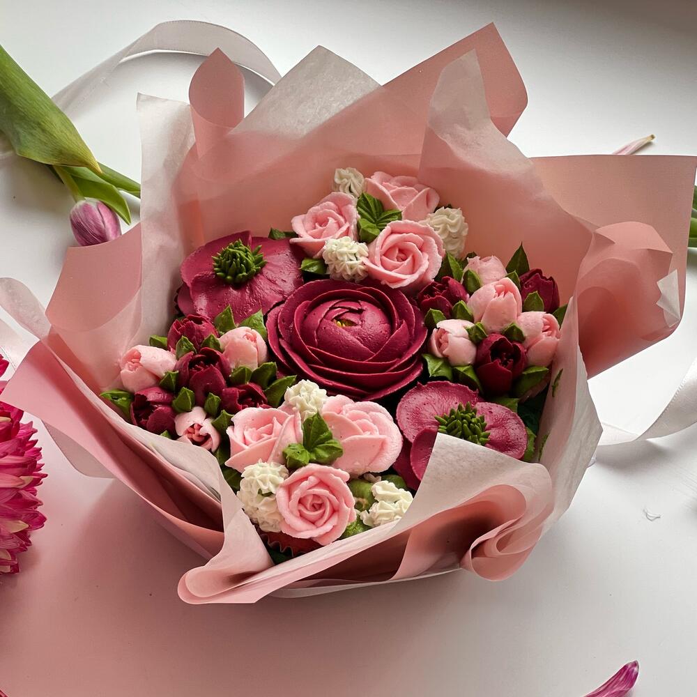 Вкус маффинов: В наших наборах по умолчанию используются маффины шоколадного вкуса, апельсинового и клубничного! В букете 7 капкейков будет 3 шоколадных 2 апельсиновых и 2 клубничных. Если тебе необходим один вкус или другое сочетание - сообщи нам! В данном наборе цветочных капкейков представлены: Открытый Пион 1 шт Мини Розы с гиацинтами 2 шт Тюльпаны 2 шт Анемоны 2 шт Помни, что изображение не всегда может точно передавать готовый капкейк, ведь каждый цветок уникален и изготавливается вручную специально для твоего заказа. Идеальный подарок для мам, бабушек, семья