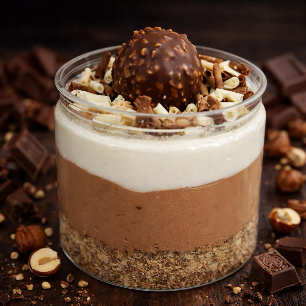 Десерт "Ферреро" — это изысканное лакомство, которое сочетает в себе нежность крема и хрустящую текстуру вафель. Основу десерта составляют тонкие вафельные коржи, которые придают ему легкость и воздушность, крем обладает насыщенным вкусом и бархатистой консистенцией. Украшением является шоколадная стружка и конфета Ферреро Роше
