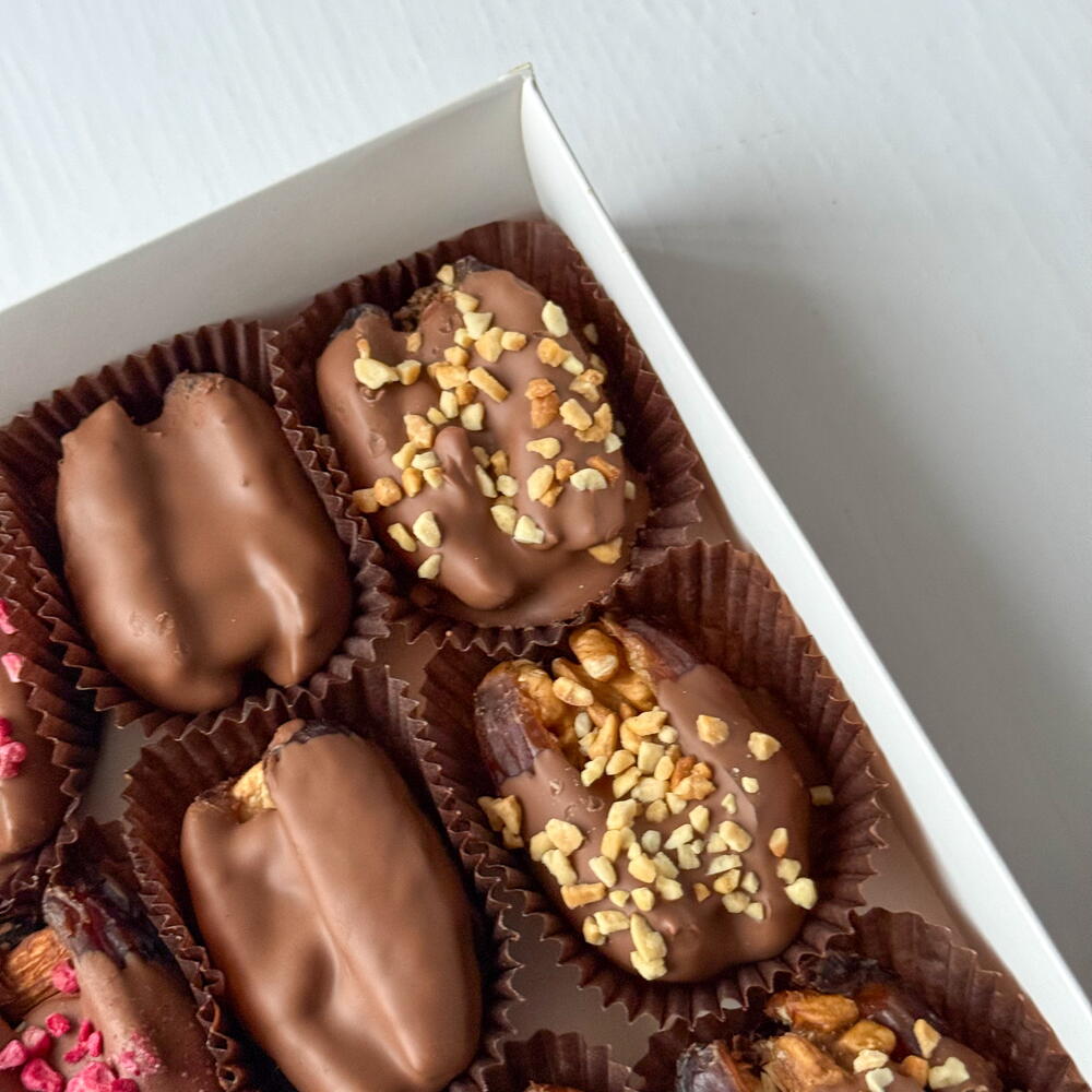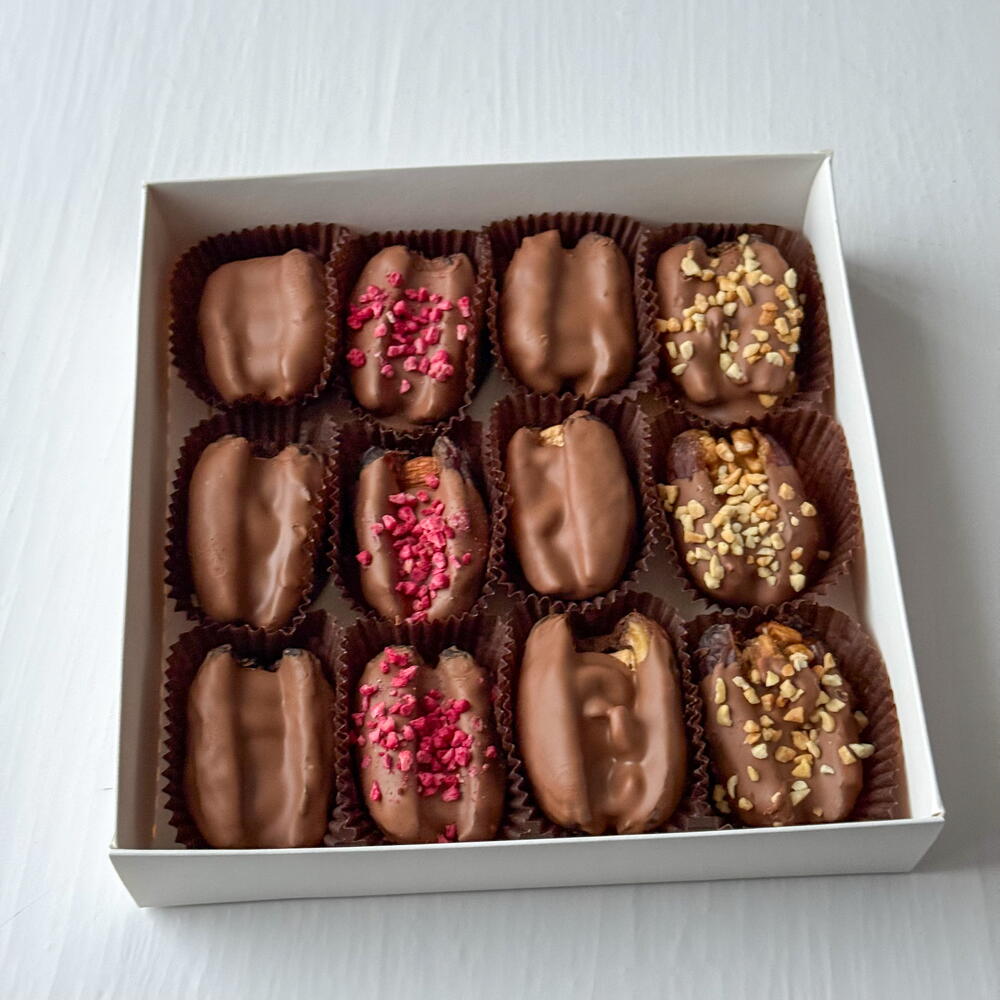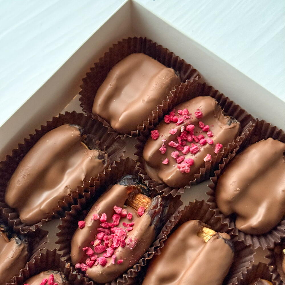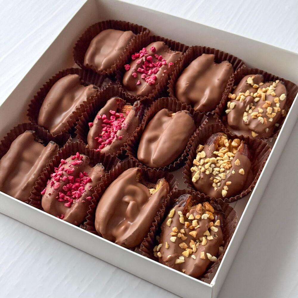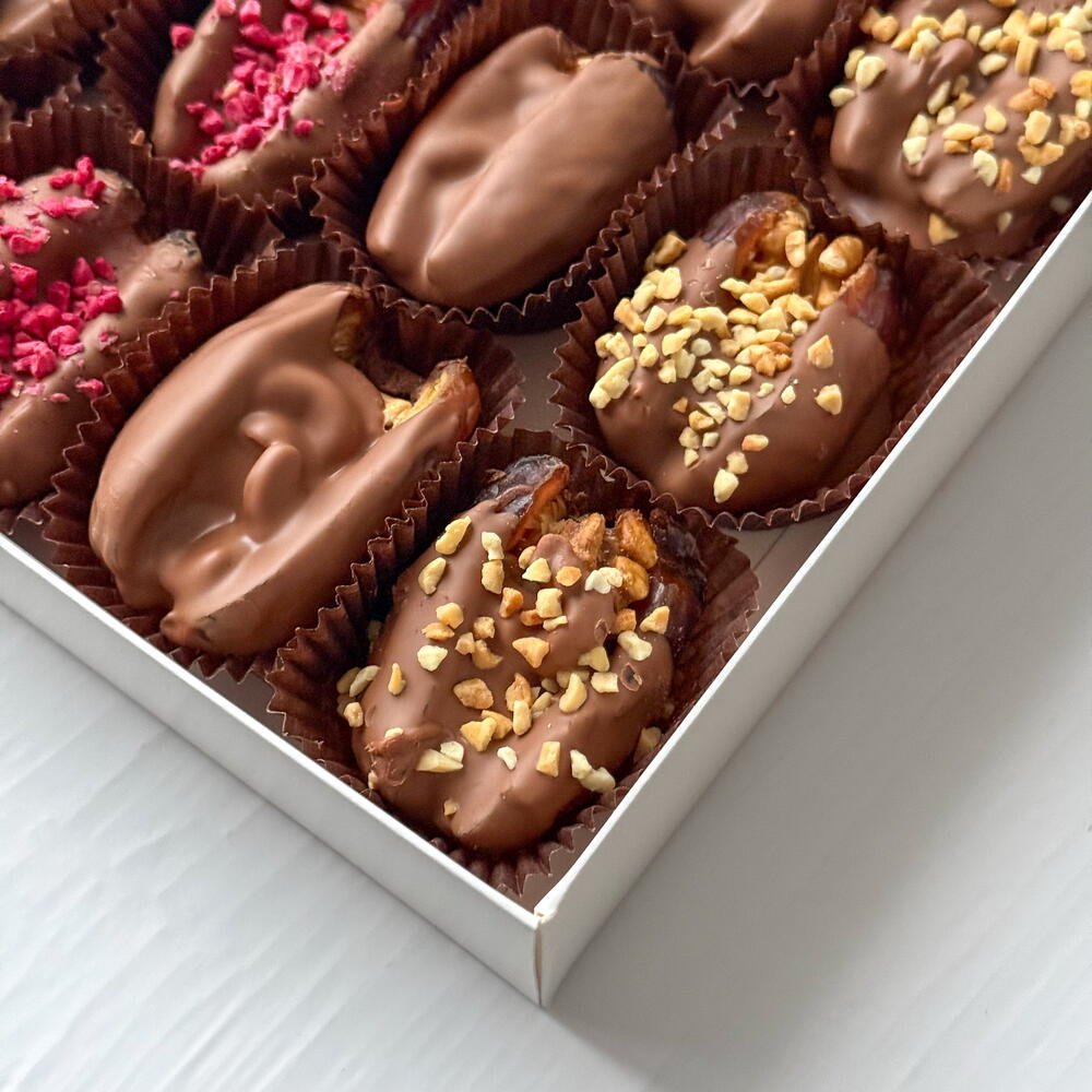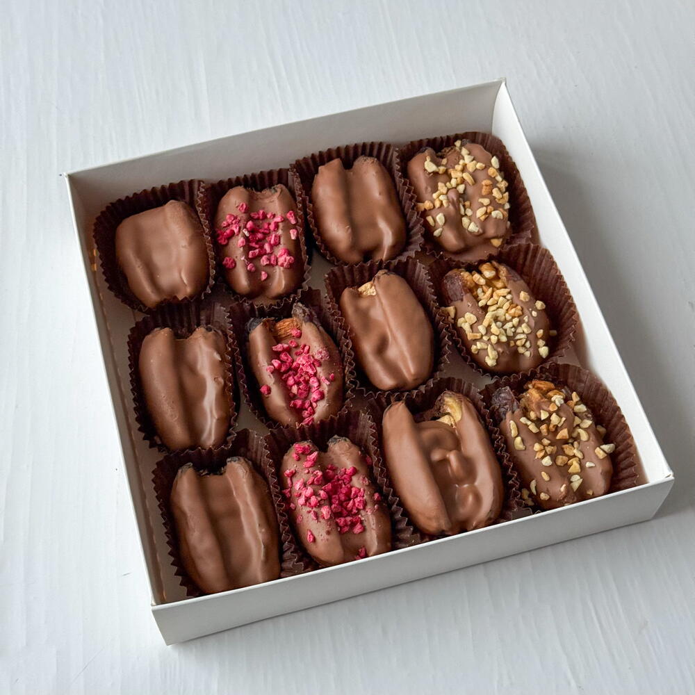 Набор королевских фиников в нежном молочном шоколаде с посыпкой из арахиса и сублимированной малины. Внутри фиников цельный миндаль, кешью, грецкий орех. В наборе 12 фиников.
