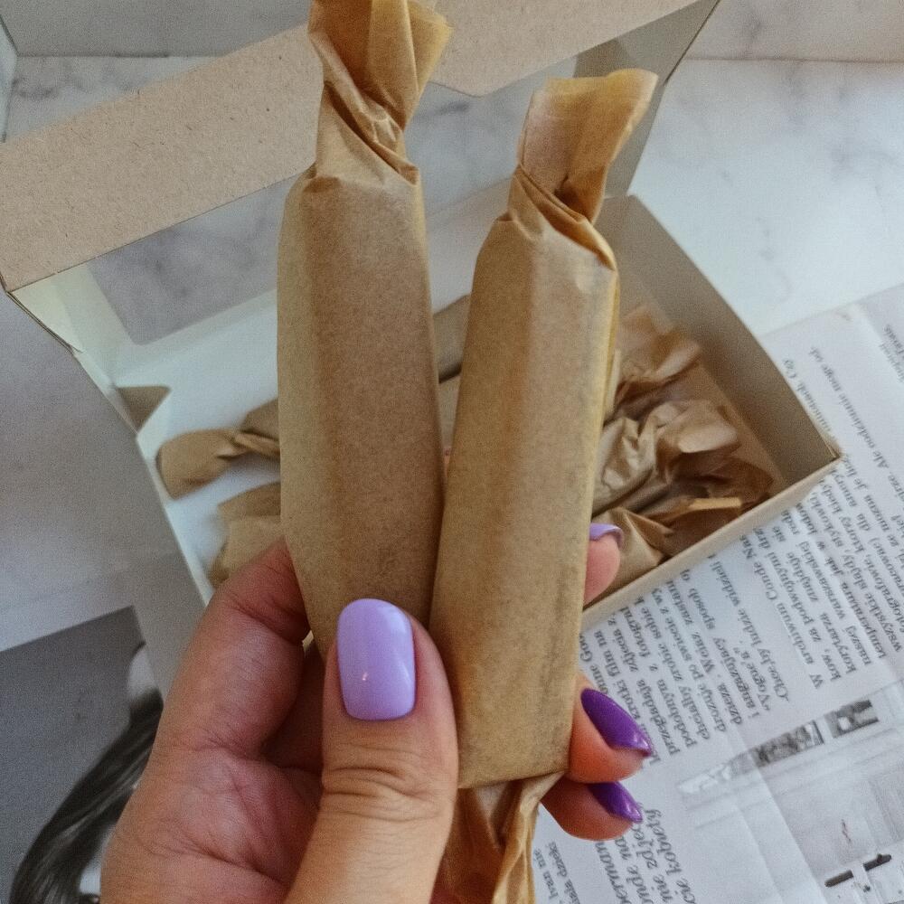 10 сливочных ирисок ручной работы. Вес каждого батончика без упаковки 25 гр. Размер 2×10см. Хранить в холодильнике, достать за 15-30 мин до чаепития для эффекта тянучки. Лента, открытка, транспортировочный крафт пакет.