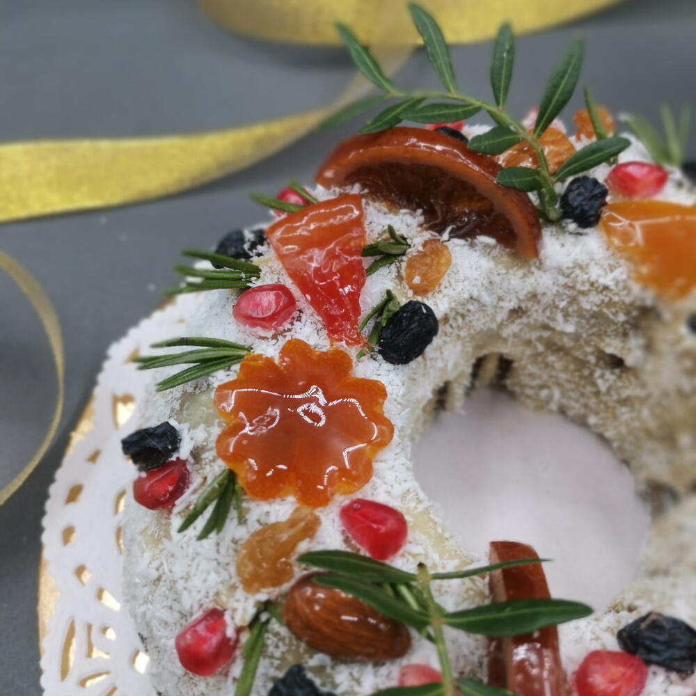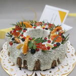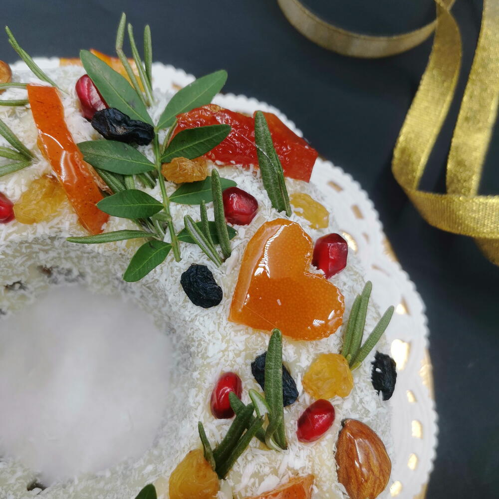 ⭐ Десерт практически без добавления сахара*. При этом естественный сладкий вкус сохраняется за счет присутствия в составе кекса сухофруктов и шоколада на меду. *Прим.: небольшое количество сахара содержится в цукатах и элементах украшения. ⭐ В приготовлении используются только натуральные ингредиенты — без искусственных ароматизаторов, жиров, красителей, консервантов и усилителей вкуса. ⭐ Срок и условия хранения: 48 часов при температуре +2°С…+6°С. КОРЖ: мука пшеничная цельнозерновая, овсяная, кукурузная, сливочное масло, яйца, темное пиво «Портер», цукаты фруктовые, изюм (3 вида), финики, апельсин (сок и цедра), мускатный орех, корица, кардамон, гвоздика, имбирь, разрыхлитель. ГЛАЗУРЬ: белый шоколад на меду, сливки, сливочное масло. УКРАШЕНИЕ: кокосовая стружка, розмарин, гранат, миндаль/ядро абрикосовой косточки, изюм, цукаты цитрусовые, кондитерский гель (агар-агар, сахар, лимонная кислота).
