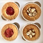 Ягодная: пшеничная мука, яйцо куриное, сахар, сливочное масло 82,5 %, творожный сыр, сливки, клубника, вишня, кукурузный крахмал Карамель/арахис: глюкозный сироп, арахис Пищевой краситель.