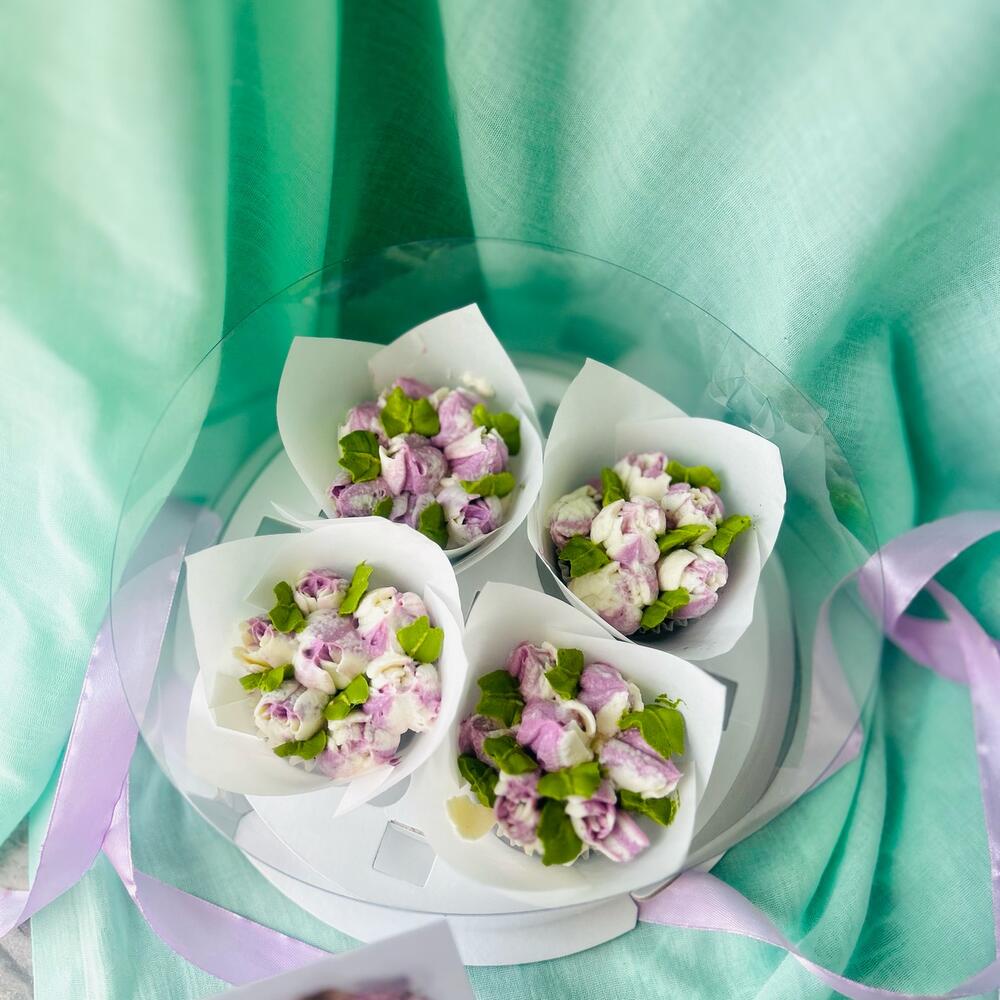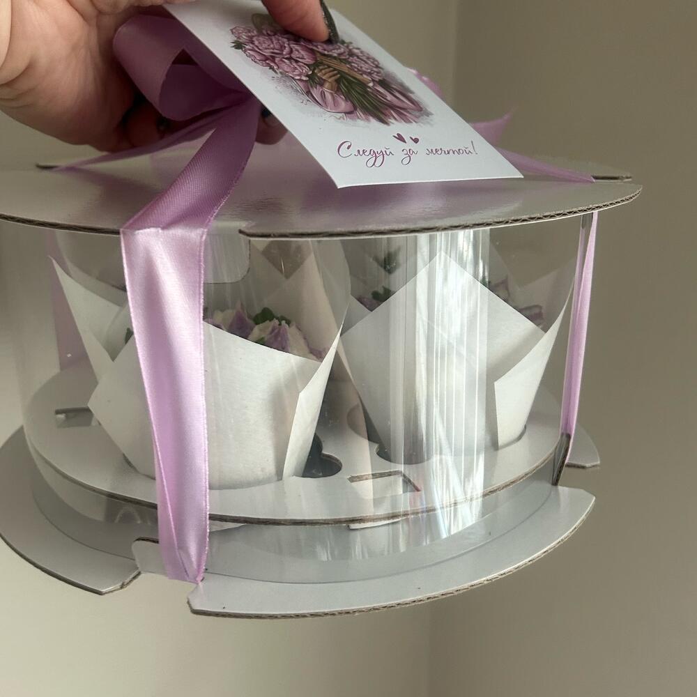 Капкейки оформленные кремовыми цветами В очаровательной круглой коробке тубусе