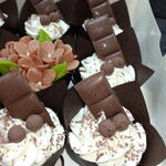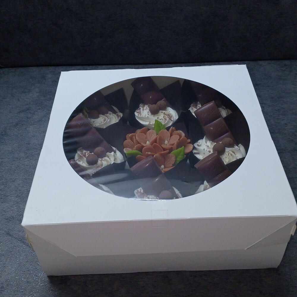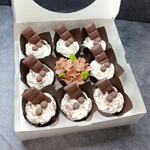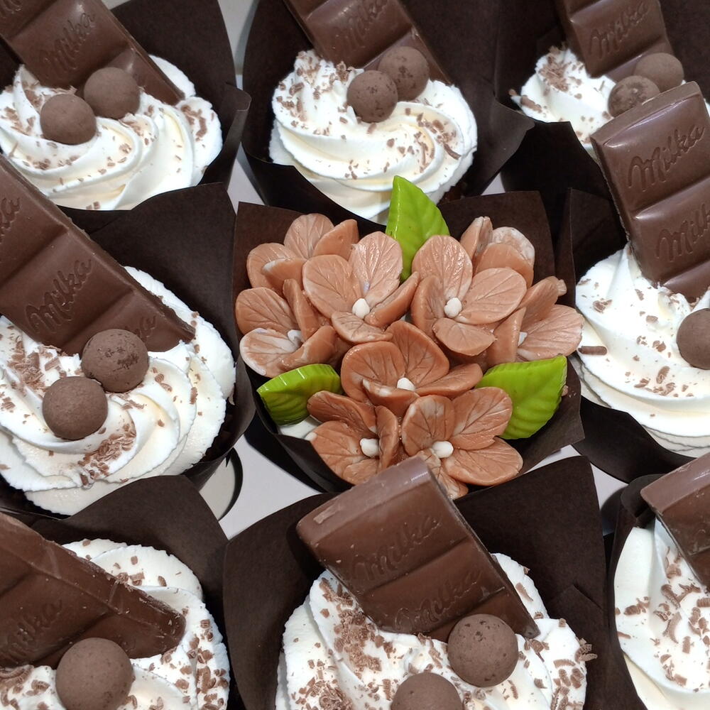 Набор шоколадных капкейков с шоколадной начинкой внутри 9шт. 8шт украшены молочным шоколадом Милка и шоколадными конфетками Пинк. Один капкейк украшен мармеладными цветочками из сгущенного молока. Отличный подарок и угощение к любому поводу. По вашему желанию приложу тематическую открытку, укажите об этом при заказе. 🌹 В рамках указанной цены можно поменять цвет букетика и крема.