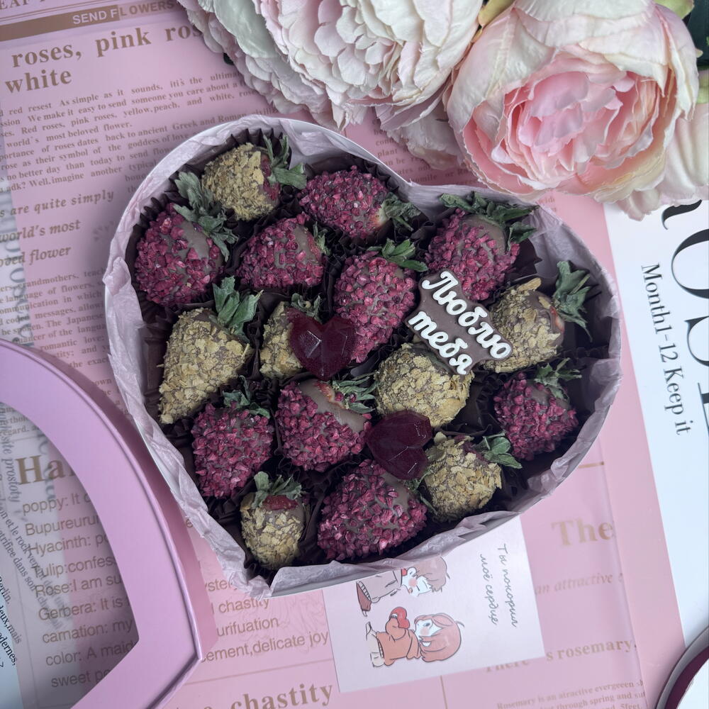 Коробка сердце в ягодами клубники в молочном (Молочный шоколад (какао-масло; тёртое какао; сухое цельное молоко; сахар; натуральные лецитин и ваниль. Содержание какао в шоколаде — 33,6%, молока — 20,8%, общее содержание жиров — 36,2%) шоколаде с посыпкой из малины и вафли станут приятным и вкусным признанием в своих чувствах.
