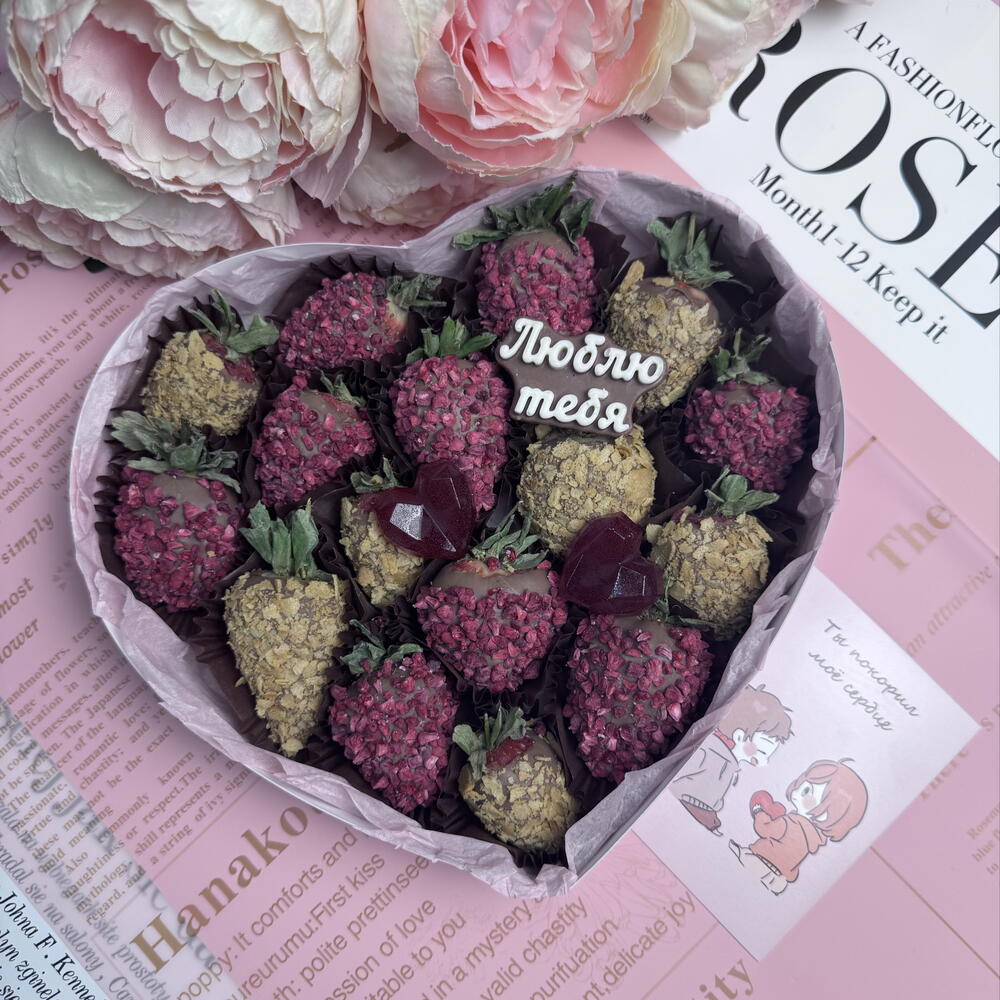 Клубника свежая, молочный шоколаде (какао-масло; тёртое какао; сухое цельное молоко; сахар; натуральные лецитин и ваниль.) Содержание какао в шоколаде — 33,6%, молока — 20,8%, общее содержание жиров — 36,2%) шоколаде с посыпкой из малины и вафли станут приятным и вкусным признанием в своих чувствах. сублимированная малина, вафельная крошка