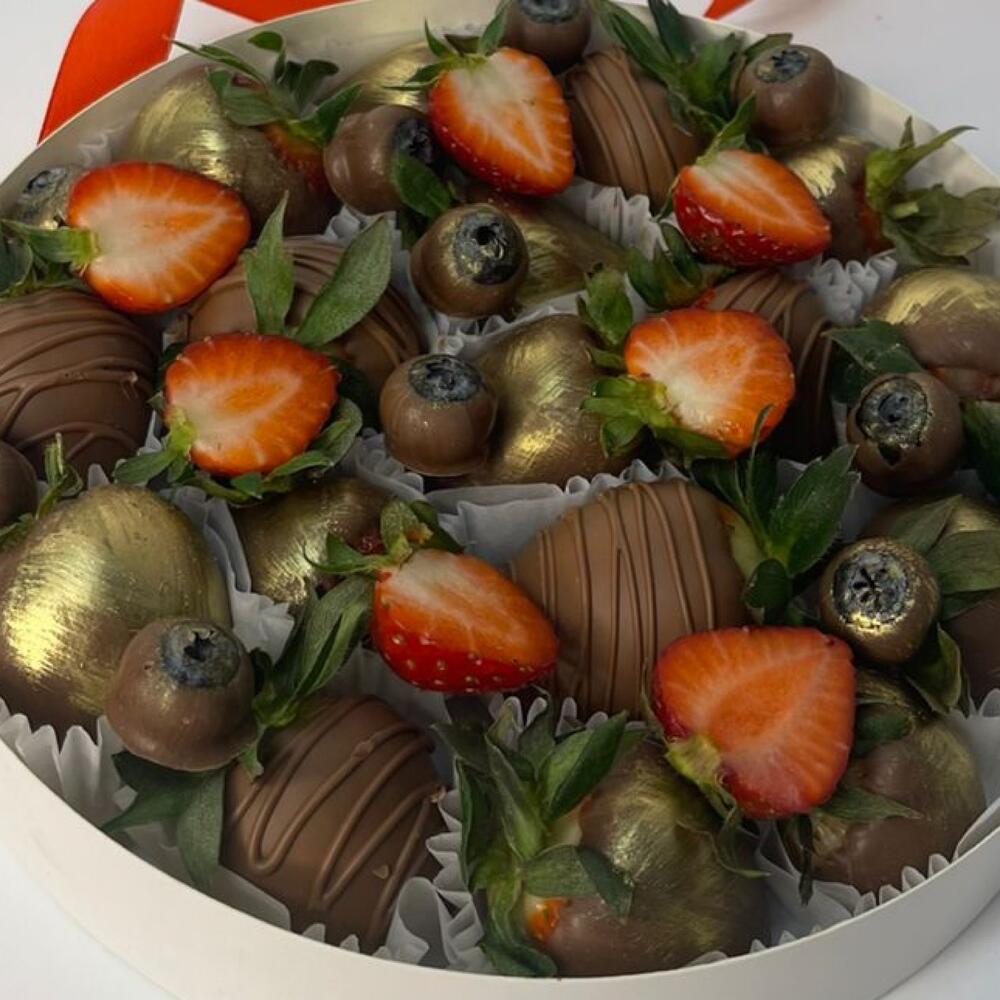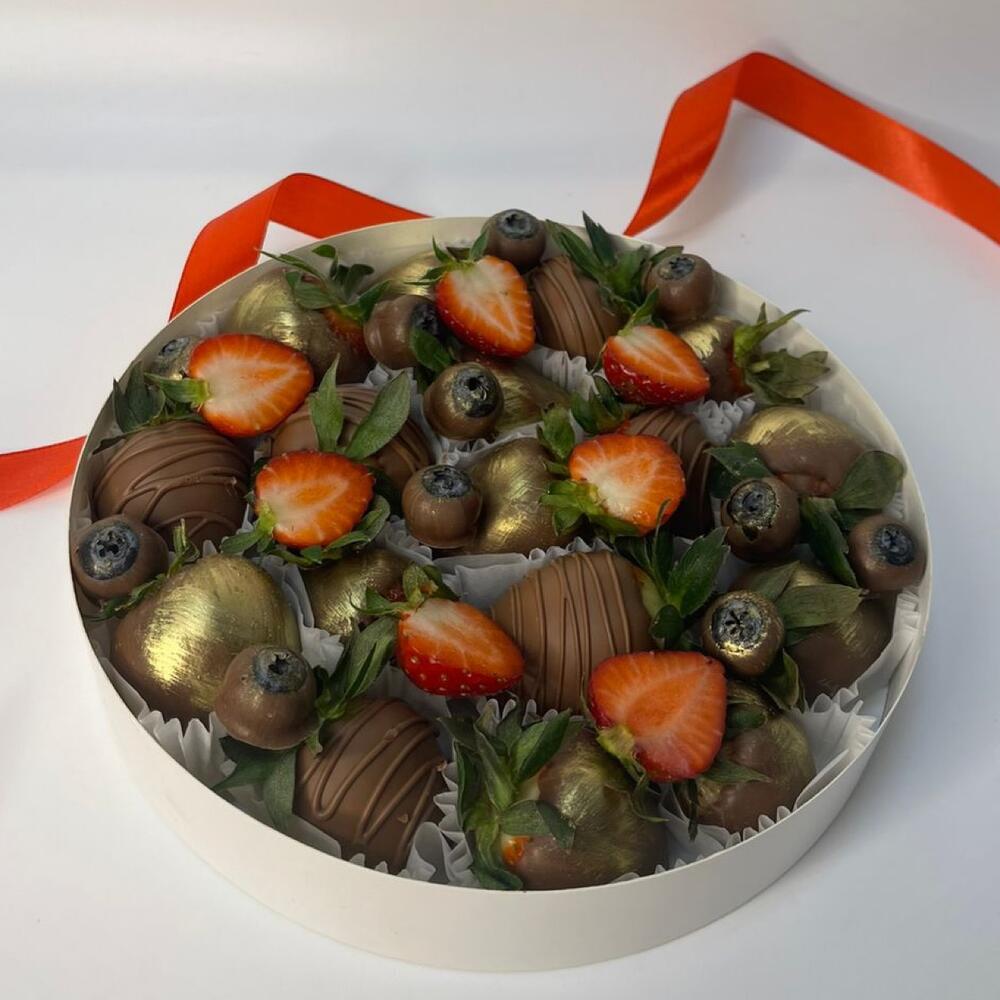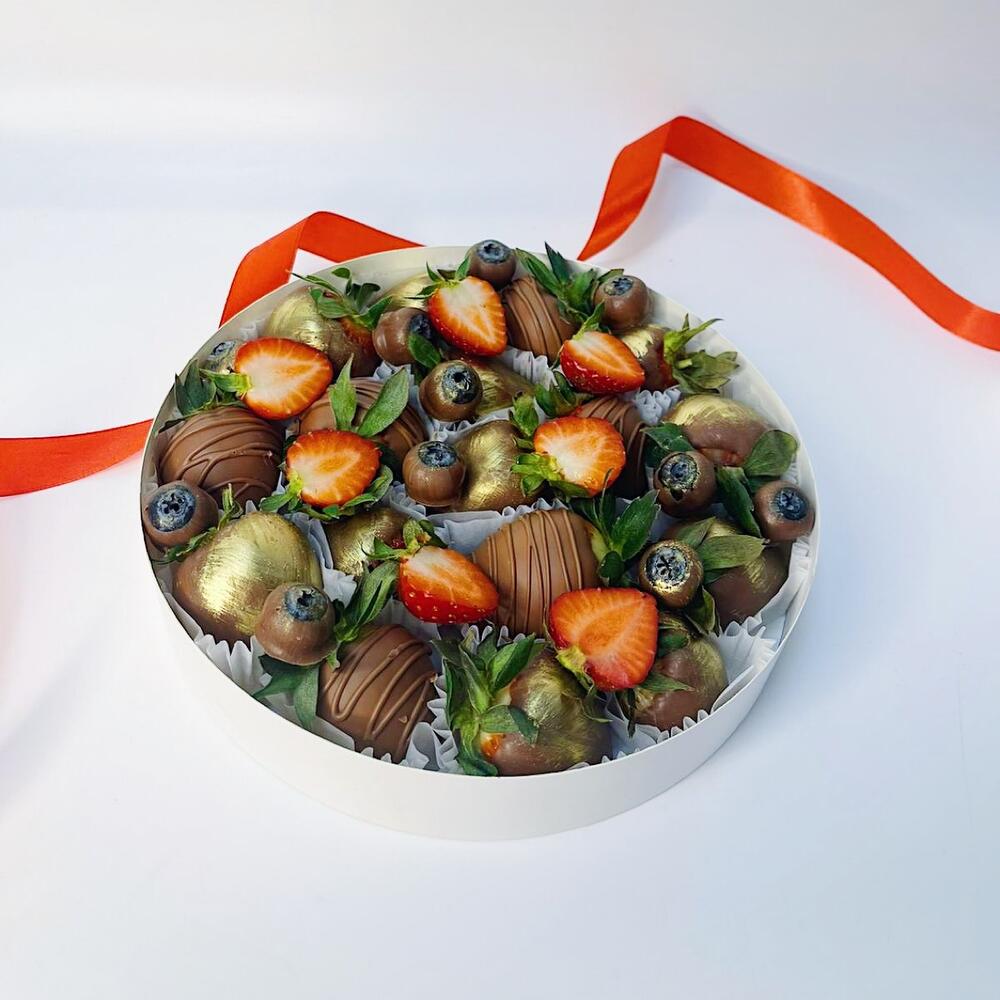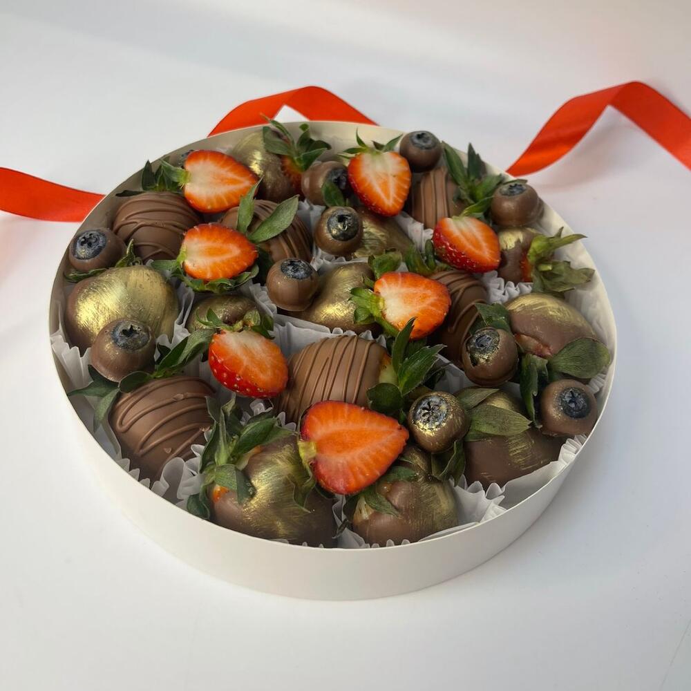 Клубника в молочном бельгийском шоколаде с малиной и голубикой. Количество ягод в наборе зависит от калибра (размера) ягоды в каждом конкретном сорте и сезоне, однако вес набора всегда остается соответствующим указанному в карточке товара.