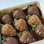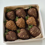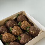 • Клубника свежая •Хрустящая крошка • Молочный бельгийский шоколад (сухое молоко, тертое какао, какао-масло, сахар или сахарная пудра) Клубника упакована в подарочную коробку, перевязанная атласной лентой, клиенту передается в подарочном пакете, украшенном конфетти.