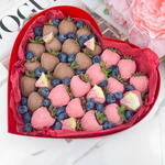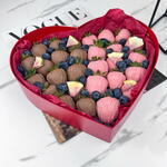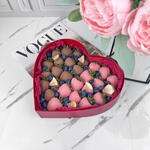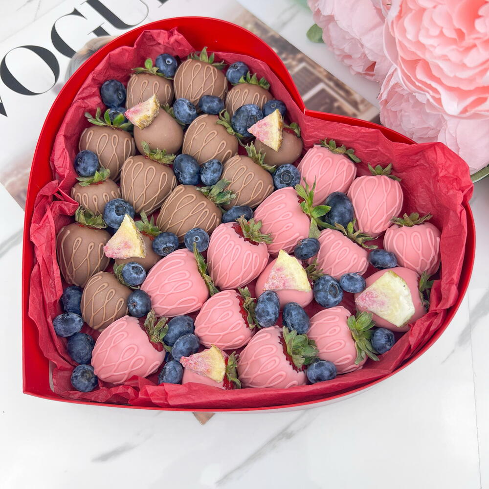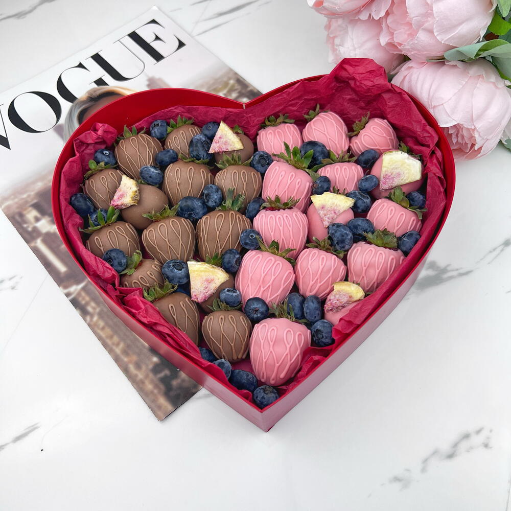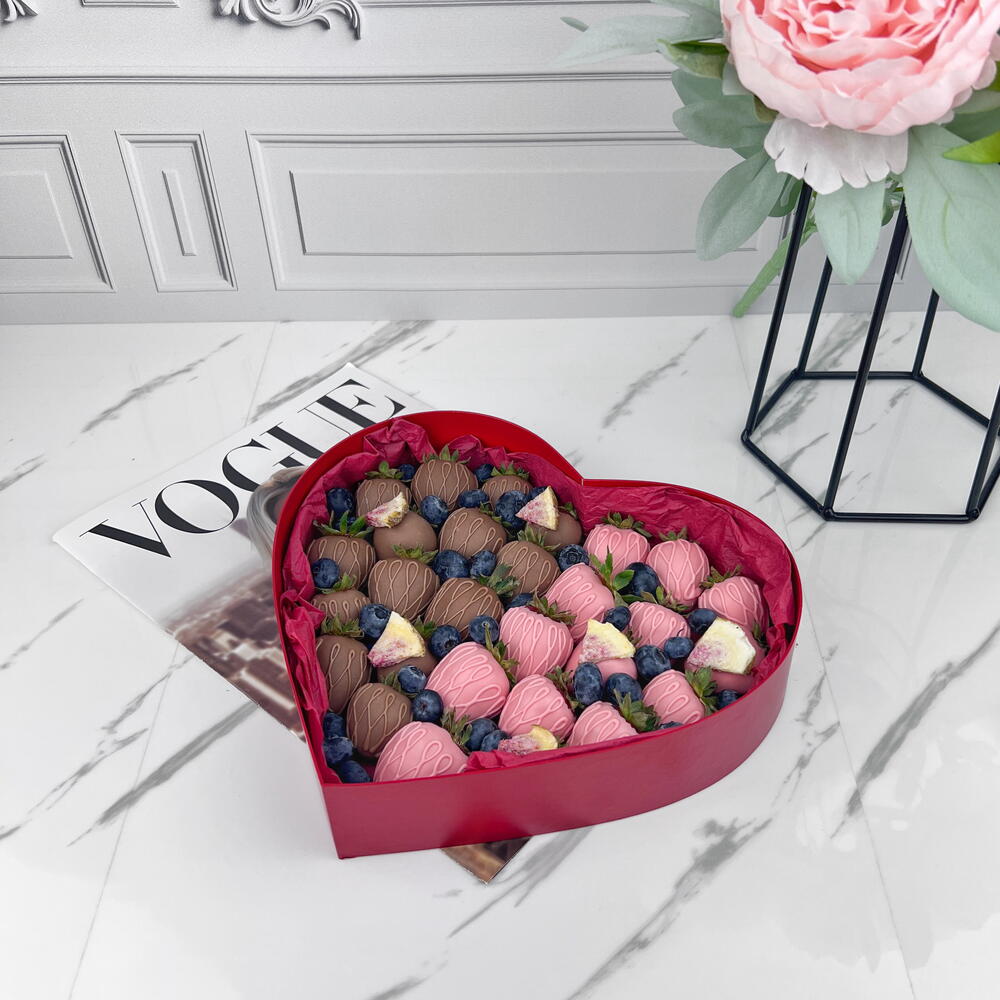Свежая и отборная клубника, молочный шоколад, сублимированная малина. Шоколад: Barry Callebaut молочный и розовый (сахар, масло какао (27,4%), сухое цельное молоко, эмульгатор: соевый лецитин, ароматизатор натуральный ваниль) Коробка в виде сердца. 24×21×5 см. Бумага тишью. Атласная лента. Крафтовый пакет.