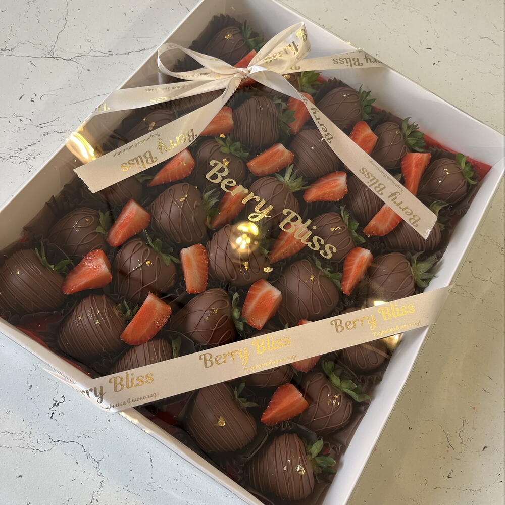 Откройте для себя мир изысканных вкусов с нашими наборами клубники в шоколаде!** В каждом наборе вас ждет отборная клубника, покрытая различными видами премиального бельгийского шоколада: *темным, молочным* и *белым*. Каждый набор дополнен сублимированными ягодами, хрустящими орешками, яркими посыпками и другими вкуснейшими топпингами, что делает его идеальным подарком для любого случая! Подарочная упаковка Мы заботимся о каждом деталях: - Наборы упакованы в стильную подарочную коробку с брендированной лентой и пакетом. - Каждая упаковка содержит информационную бирку с инструкцией по хранению. Условия хранения - **Количество ягод:** 30 или 35 в зависимости от размера ягоды - **Срок годности:** 24часов. - **Рекомендации по хранению:** храните в холодильнике при температуре +4 °C. Перед употреблением подержите при комнатной температуре 5-10 минут для лучшего вкуса. Порадуйте себя или своих близких, выбрав этот прекрасный подарок, который обязательно вызовет улы