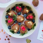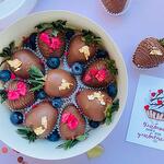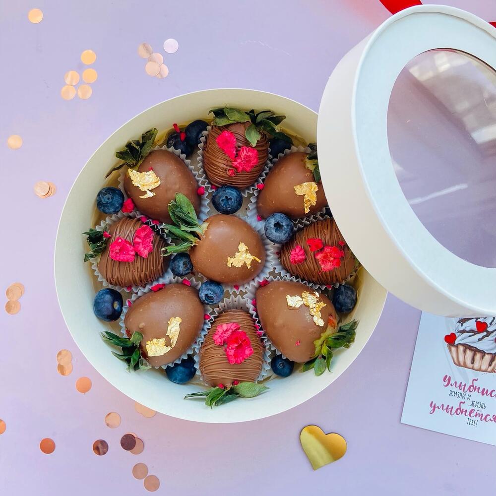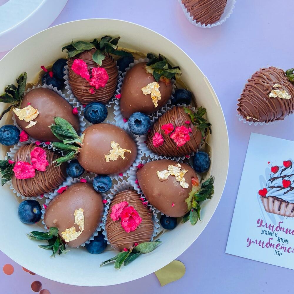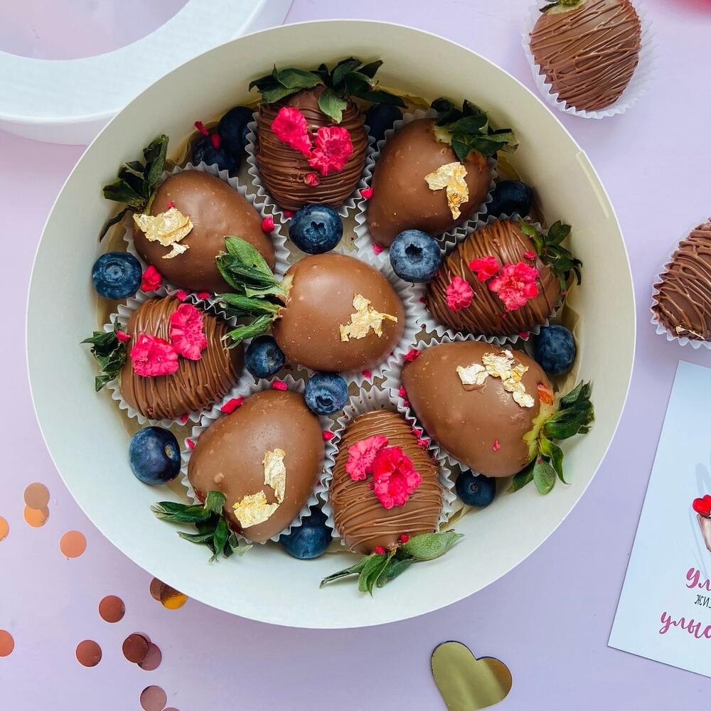 Свежая, сладкая клубника в бельгийском молочном шоколаде, в декоре голубика, малина, пищевое золото! Упаковано в коробку тубус, открытка в подарок