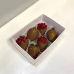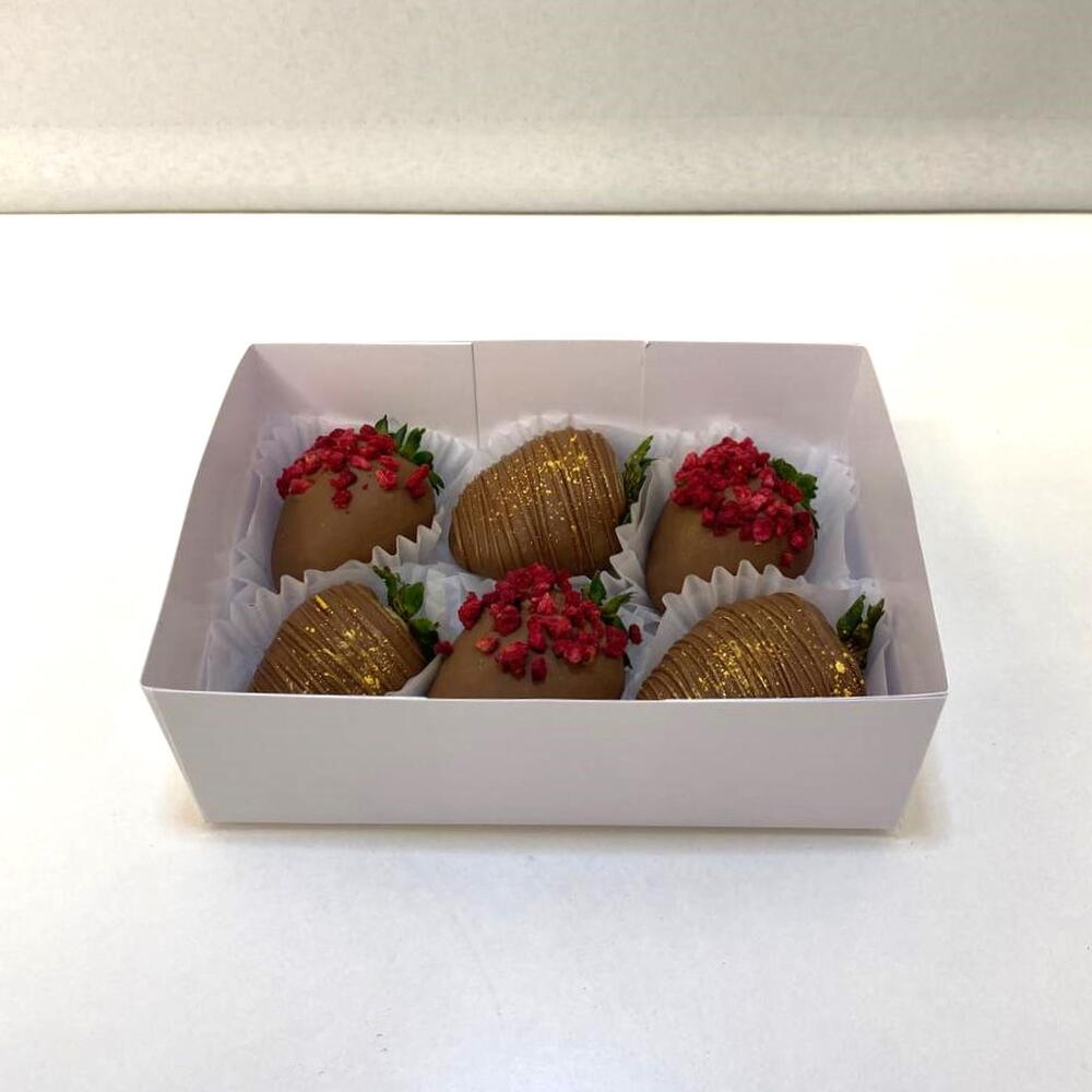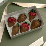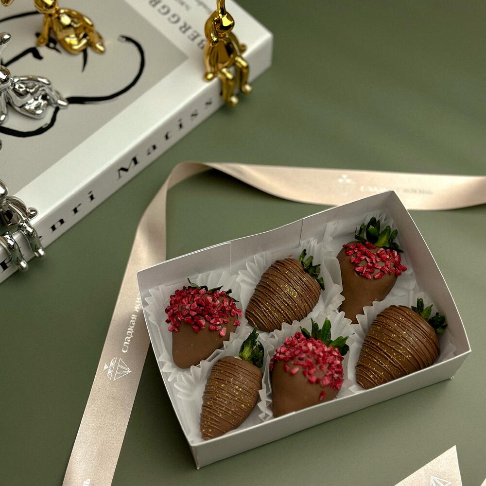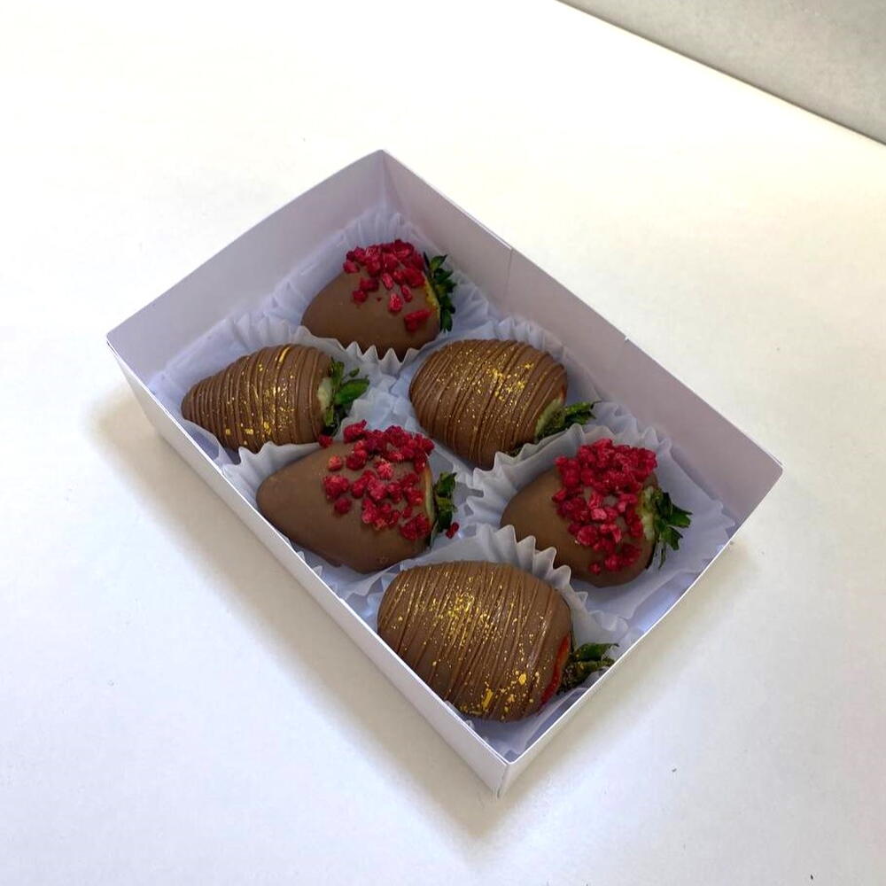 Набор из шести ярких ягод клубники, облачённых в мягкий слой качественного молочного бельгийского шоколада, представляет собой настоящее произведение кулинарного искусства. Каждый плод искусно украшен декоративными шоколадными полосками и воздушной сублимированной малиной, создающей приятный контраст и обогащающей вкус яркими фруктовыми оттенками. Эта комбинация нежности, аромата и эстетики сделает ваш выбор идеальным для особого повода или простого удовольствия насладиться гармоничным сочетанием натуральных продуктов высокого качества.