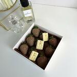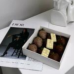 Молочный и белый бельгийский шоколад Sicao (сахар, масло какао, сухое цельное молоко, какао тертое, эмульгатор: cоевый лецитин, натуральный ароматизатор: ваниль), съедобные блестки Белая коробочка премиум с открытым окошком, атласная ленточка.