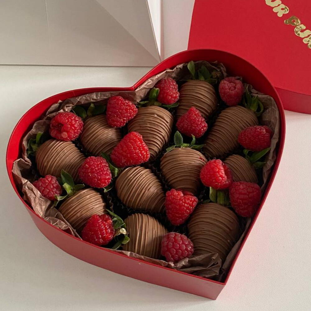 Клубника и малина отборная; шоколад callebaut (сахар, масло какао, сухое цельное молоко, какао тертое, эмульгатор соевый лецитин, ароматизатор натуральный ваниль)