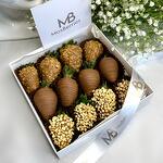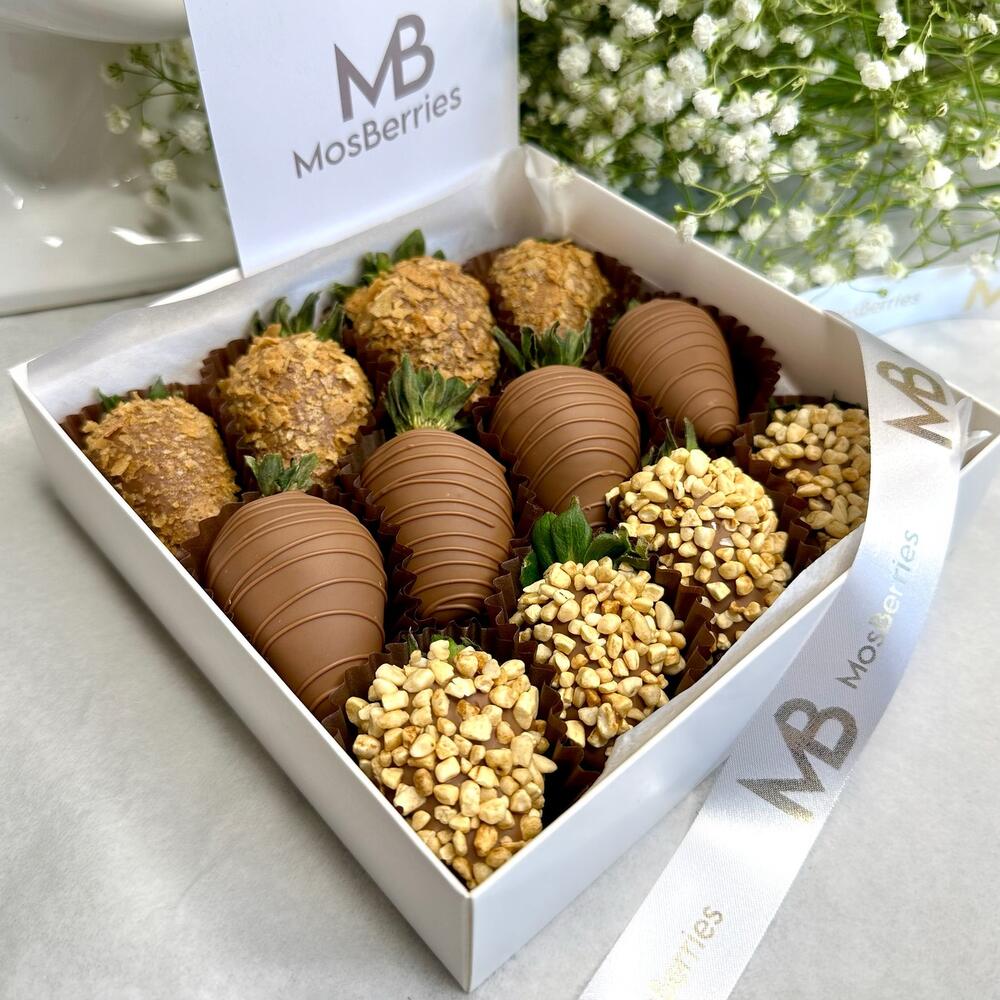 9-16 ягод (количество зависит от размера клубники) - Свежая отборная клубника; - Молочный шоколад 33,6% какао: сахар, масло какао, сухое цельное молоко, какао тертое, эмульгатор соевый лецитин, ароматизатор натуральный ваниль, какао. Элементы кондитерского дизайна: - Вафельная крошка Paillete Feuilletine Callebaut; - Воздушный рис в карамели. Упаковка: - Подарочная коробка; - Веточка гипсофилы; - Информационная карточка; - Брендированная лента; - Фирменный пакет; - Фирменная открытка с Вашим текстом (по желанию); -Бумажные подложки; -Фирменная наклейка.
