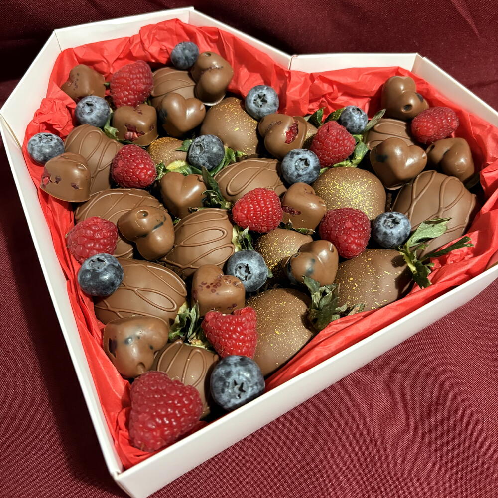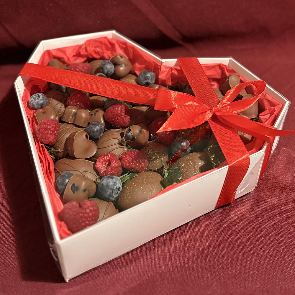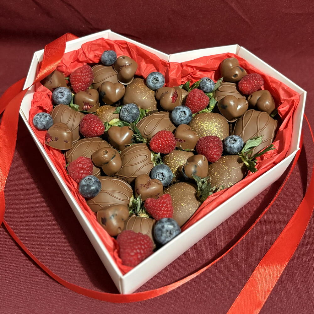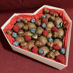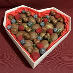 Изысканный подарок в коробке‑сердце — прекрасный способ выразить чувства или сделать приятный сюрприз! В наборе: - клубника в шоколаде; - голубика в шоколаде; - малина в шоколаде; - свежая малина; - свежая голубика. Особенности: - гармоничное сочетание шоколада и свежих ягод; - аккуратная укладка в форме сердца; - только отборные ягоды и качественный шоколад. Идеальный вариант для подарка своему защитнику или без повода — просто чтобы порадовать любимого человека! Срок хранения: 24 часа Хранить при температуре от +6 до +20 градусов, перед употреблением рекомендуем оставить набор в комнатной температуре на 15-30 минут. По возможности, съесть в течение 10-12 часов, чтобы все вкусы остались яркими и десерт не потерял свою форму.