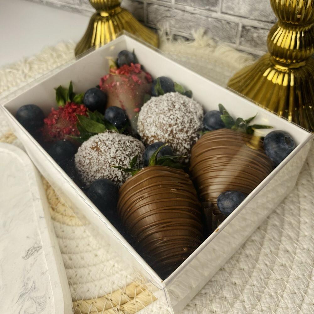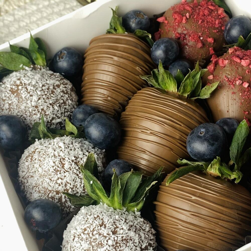 Свежая отборная клубника, голубика, кокосовая стружка, сублимированная малина, бельгийский молочный шоколад (сахар, масло какао, молоко цельное сухое, какао тертое, сыворотка молочная сухая, жир молочный, эмульгатор (соевый лецитин), натуральный ароматизатор (ваниль).