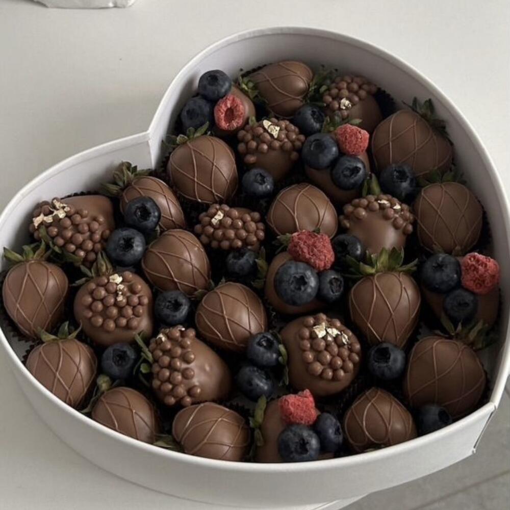 1)Свежая голубика 2)Свежая клубника 3)Сублимированная малина 4)Бельгийский шоколад ( состав:масло какао; сухое цельное молоко; какао тертое; сухая молочная сыворотка; обезвоженный молочный жир; эмульгатор: лецитин; ароматизатор: ванилин идентичный натуральному. 5) Коробка в форме сердца
