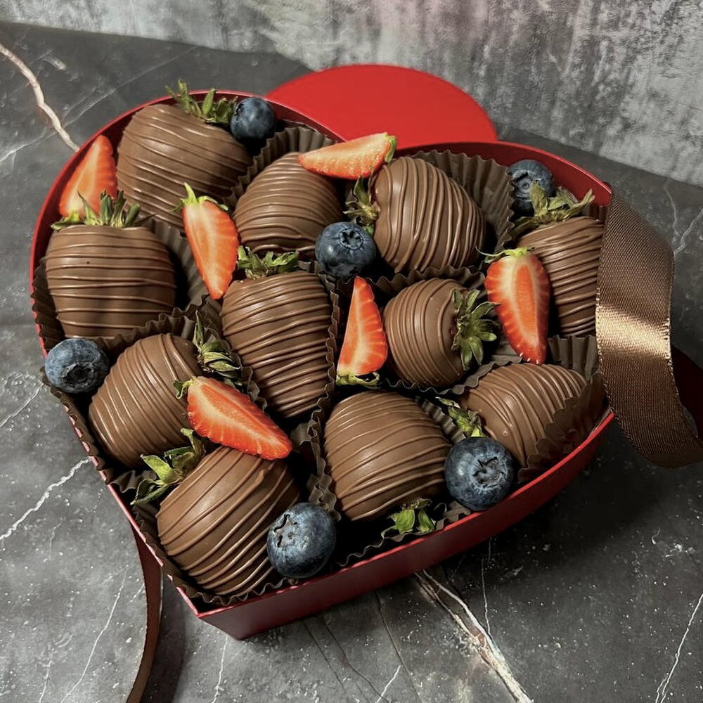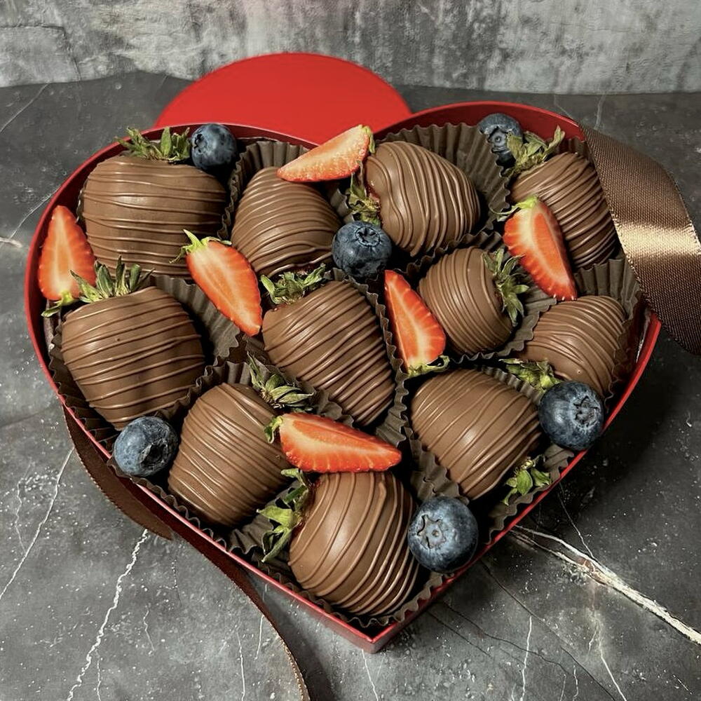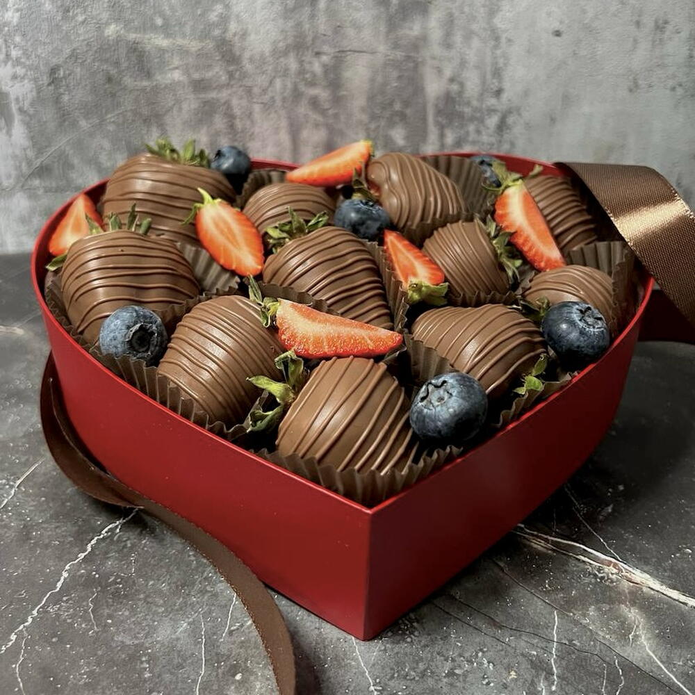 Сладкое признание в коробке-сердце: изысканная клубника в нежном молочном шоколаде с изящными шоколадными полосками, украшенная сочными ягодами свежей клубники и голубики. Каждая ягодка — маленькое произведение искусства: бархатистый шоколад обволакивает спелую клубнику. Свежие ягоды добавляют композиции яркость и сочность. Элегантная упаковка в форме сердца делает этот десерт идеальным подарком для выражения самых нежных чувств. Подарите момент истинного наслаждения себе или близким, и пусть каждая ягода расскажет о вашей любви! Отличный подарок для любимой мамы, бабушки. Подарок на День матери! Хранить при температуре от +6 до +20 градусов, перед употреблением рекомендуем оставить набор в комнатной температуре на 15-30 минут. По возможности, съесть в течение 10-12 часов, чтобы все вкусы остались яркими и клубника не потеряла свою форму.