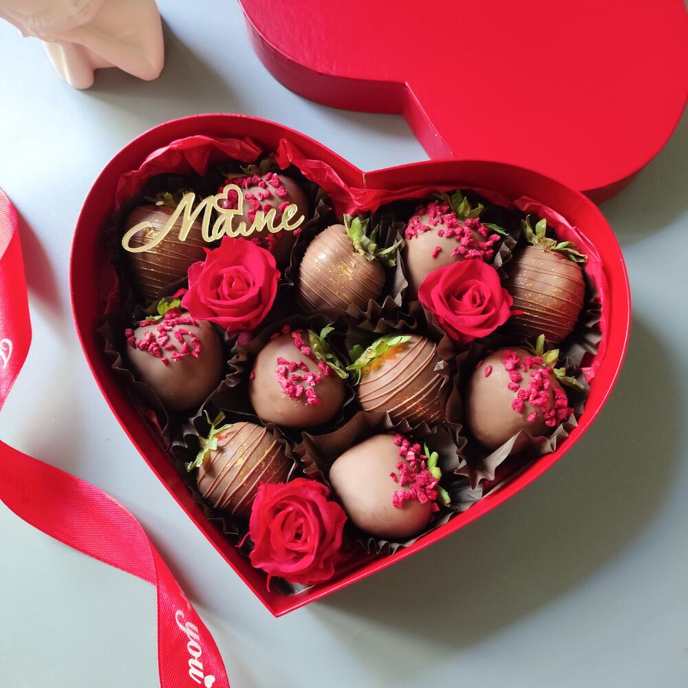 Набор клубники в молочном шоколаде премиум качества, украшенный шоколадными кусочками сублимированной малины и пищевым блеском. В набор добавлен акриловый несъедобный топпер Маме♥️ Набор отлично подойдёт в подарок вашему дорогому человеку . В состав набора также входят 3 красные розы, которые прошли специальную обработку (стабилизацию) и не завянут до 5 лет.
