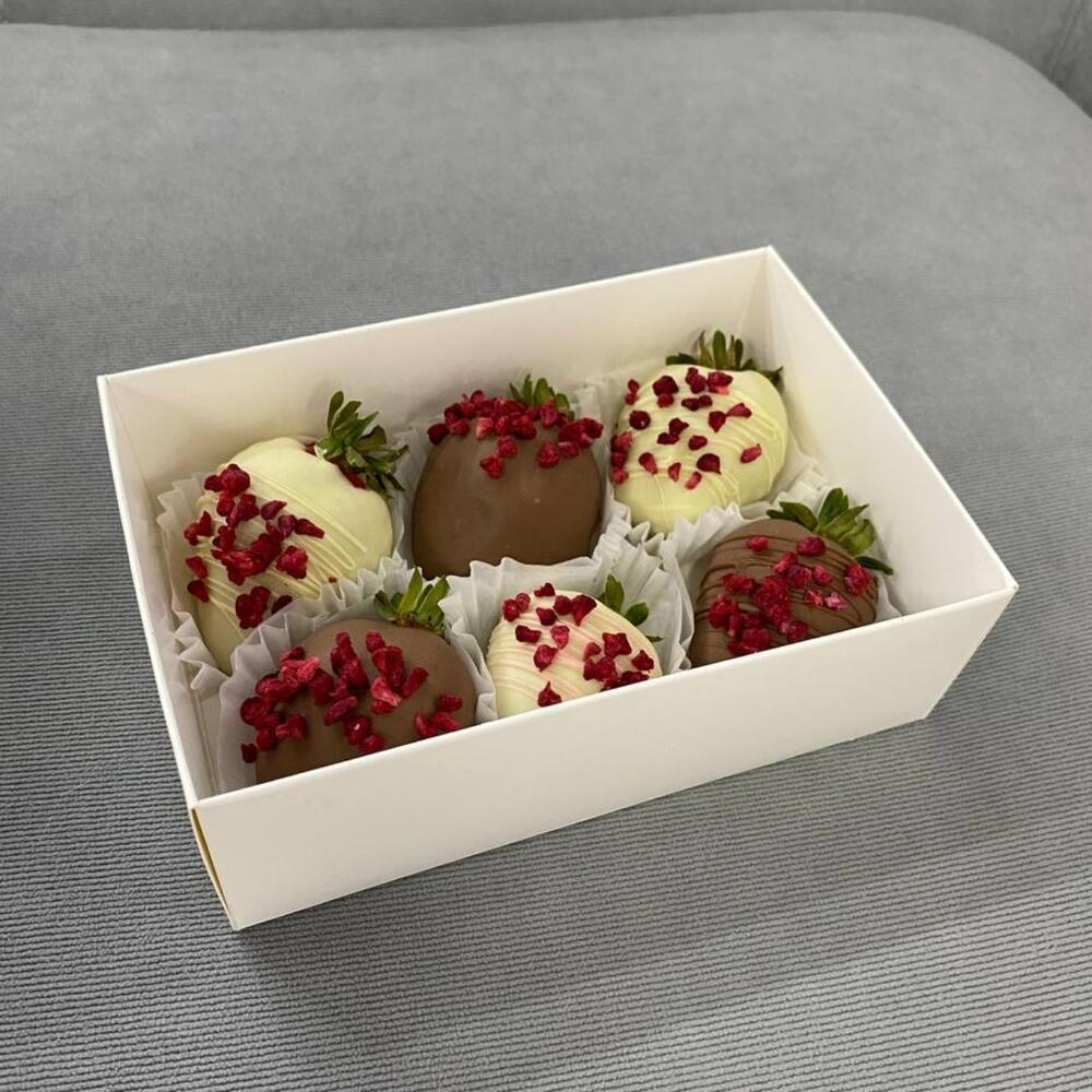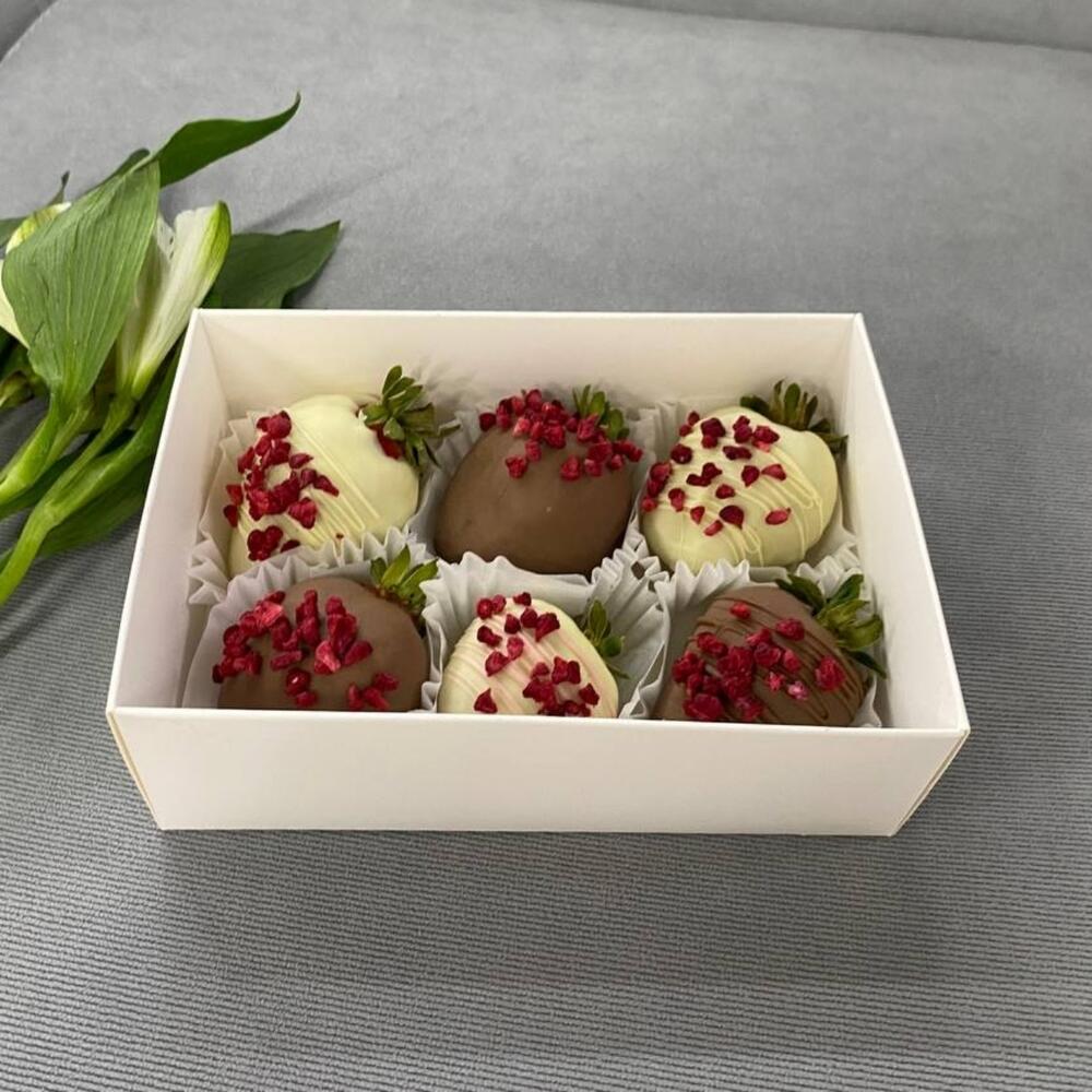 Набор клубники в белом и молочном бельгийском шоколаде с добавлением сублимированной малины и декоративными шоколадными полосками — настоящий шедевр кондитерского искусства. Украшение из сушеных ягод малины добавляет легкую кислинку и эстетический шарм. Этот изысканный десерт порадует ценителей оригинальных сладостей и станет отличным подарком для близких.