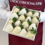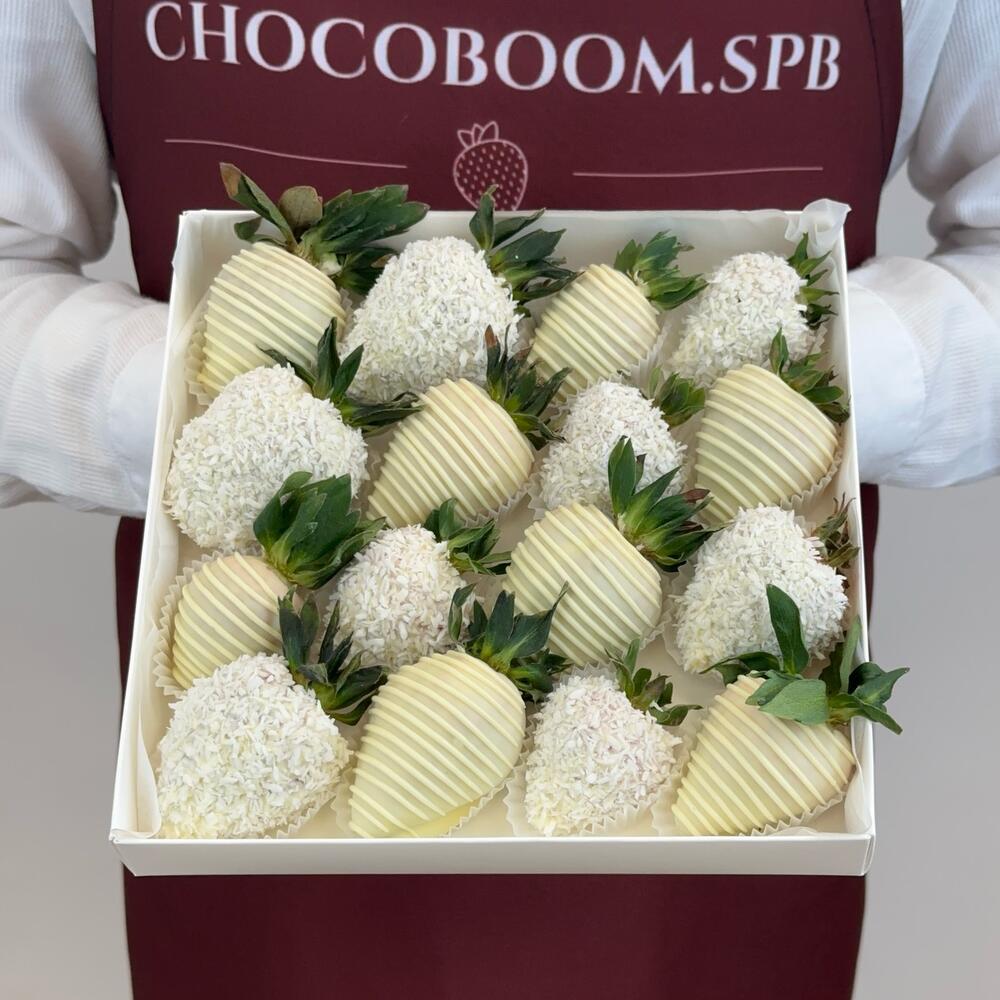 Изысканный набор из клубники в белом бельгийском шоколаде Premium класса. Для декорирования используется высококачественная кокосовая стружка. ❗️Важно. Мы не используем красители! Весь цветной шоколад имеет вкусовые добавки, заготавливаемые заводом производителя. 🍓Количество ягод в композиции может разниться и зависит от калибра клубники. 🌱Срок хранения 24 часа при температуре от +2 до +6 ✨Все наборы упакованы в коробочку с прозрачной крышкой, перевязаны брендированной лентой и доставляются в фирменном подарочном пакете. ↔️Размер упаковки: 12*12 см. (9-12 ягод) 16*16 см. (16-20 ягод) 20*20 см. (25-30 ягод) 24*24 см. (36-42 ягод) Стильные и эксклюзивные клубничные подарки с доставкой для ваших родных и близких от студии Chocoboom.spb❤️
