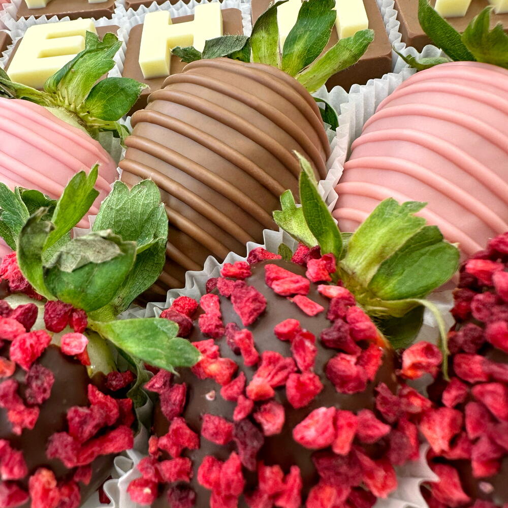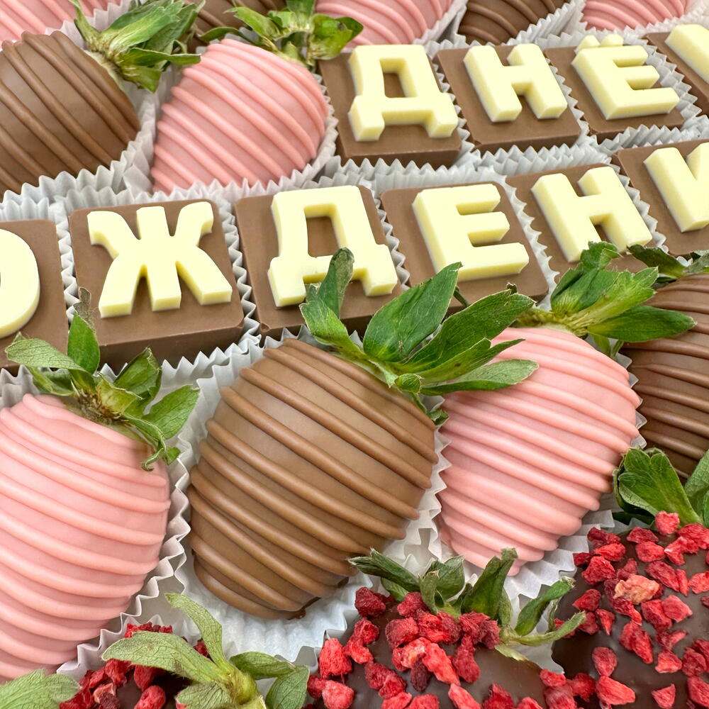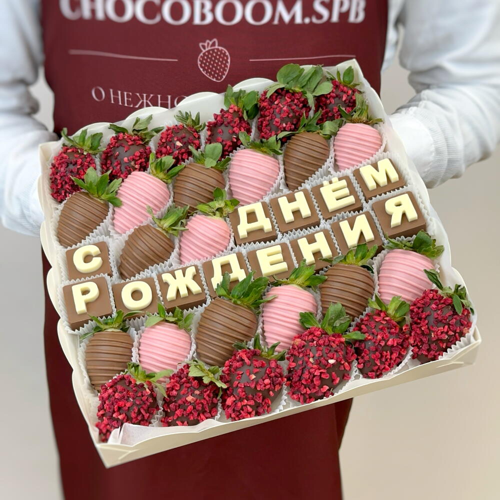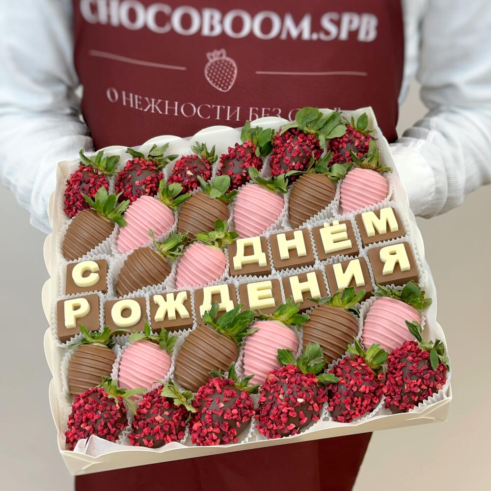 Изысканный набор из клубники в молочном, розовом-клубничном и тёмном бельгийском шоколаде Premium класса. Для декорирования используется высококачественная сублимированная малина. Буквы выполнены из белого и молочного бельгийского шоколада. ❗️Важно. Мы не используем красители! Весь цветной шоколад имеет вкусовые добавки, заготавливаемые заводом производителя. 🍓Количество ягод в композиции может разниться и зависит от калибра клубники. 🌱Срок хранения 24 часа при температуре от +2 до +6 ✨Все наборы упакованы в коробочку с прозрачной крышкой, перевязаны брендированной лентой и доставляются в фирменном подарочном пакете. ↔️Размер упаковки: 25*25 см. Стильные и эксклюзивные клубничные подарки с доставкой для ваших родных и близких от студии Chocoboom.spb❤️