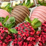 • Свежая клубника • Молочный шоколад Callebaut (Бельгия) • Тёмный шоколад Callebaut (Бельгия) • Розовый - клубничный шоколад Callebaut (Бельгия) • Сублимированная малина