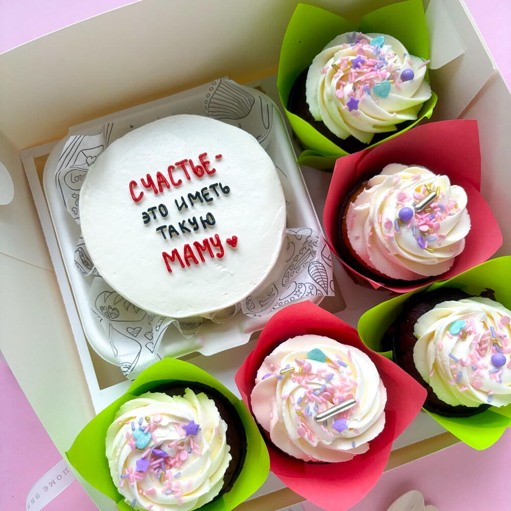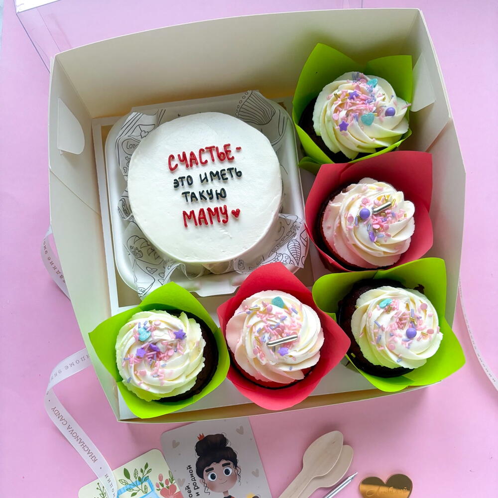 Комбо набор средний бенто торт "Счастье иметь такую маму" и 5 капкейки /маффины с сахарной посыпкой жене, мамочке, бабушке