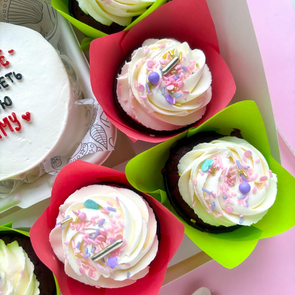 Набор Капкейки / маффины 5шт с сахарной посыпкой + бенто тортик. Этот комбо отлично подойдет в подарок для мамы, бабушки, жены, тещи, свекрови ⠀ В коробочке капкейков сразу 2 вкуса капкейков,: 🍒красный бархат с вишней, 🍋🍓лимонный бисквит с клубникой. Крем чиз на основе сливок и творожного сыра. Очень вкусные и не приторно сладкие, каждый гость сможет выбрать вкус, который ему больше понравится👍🏼 ⠀ Размер коробки 23х11, вес 1кг, в комплекте свечка, 2 мини ложечки, лента и крафтовый пакет. ⠀ 🍰Предлагаю 3 вкуса на выбор: 1️⃣ 🍒Красный бархат с вишней. Идеально для тех, кто не любит сильно сладко 2️⃣ 🍫 Шоколадный молочный ломтик, в меру сладкий. Для любителей шоколадных десертов. 3️⃣ 🥕🍐Морковный и грушей и грецким орехом: более сладкий. Вкусные морковные ароматные коржи, пряная грушевая начинка ⠀ Размер коробочки 13х13см, торт 10х5см вес 400гр. В комплекте: тортик, 2 мини деревянных ложечки, свечка, лента, упакован в эко ланч-бокс и крафтовый пакет ⠀ Можете добавить открытку, дополнительные ложки, печеньки с предсказаниями или подарочный пакет, все варианты есть в доп. товарах, они появятся при добавлении тортика в корзину. ⠀ 🤗Дарите эмоции и вкусные тортики Вашим близким, заказывайте сейчас. ⠀ ❤️Любовь в каждом кусочке, Катерина Khachanova candy