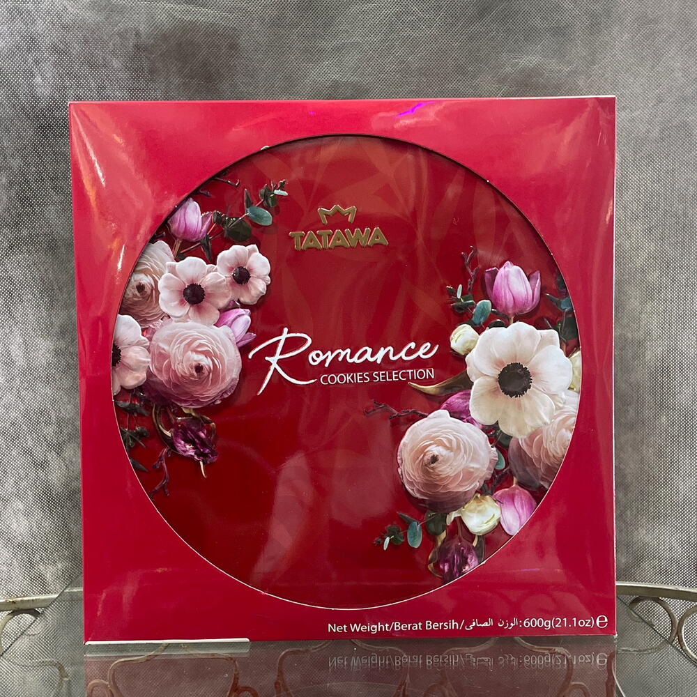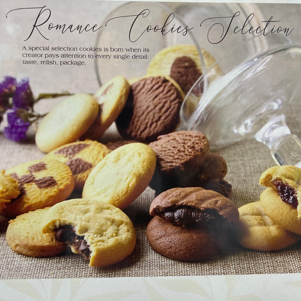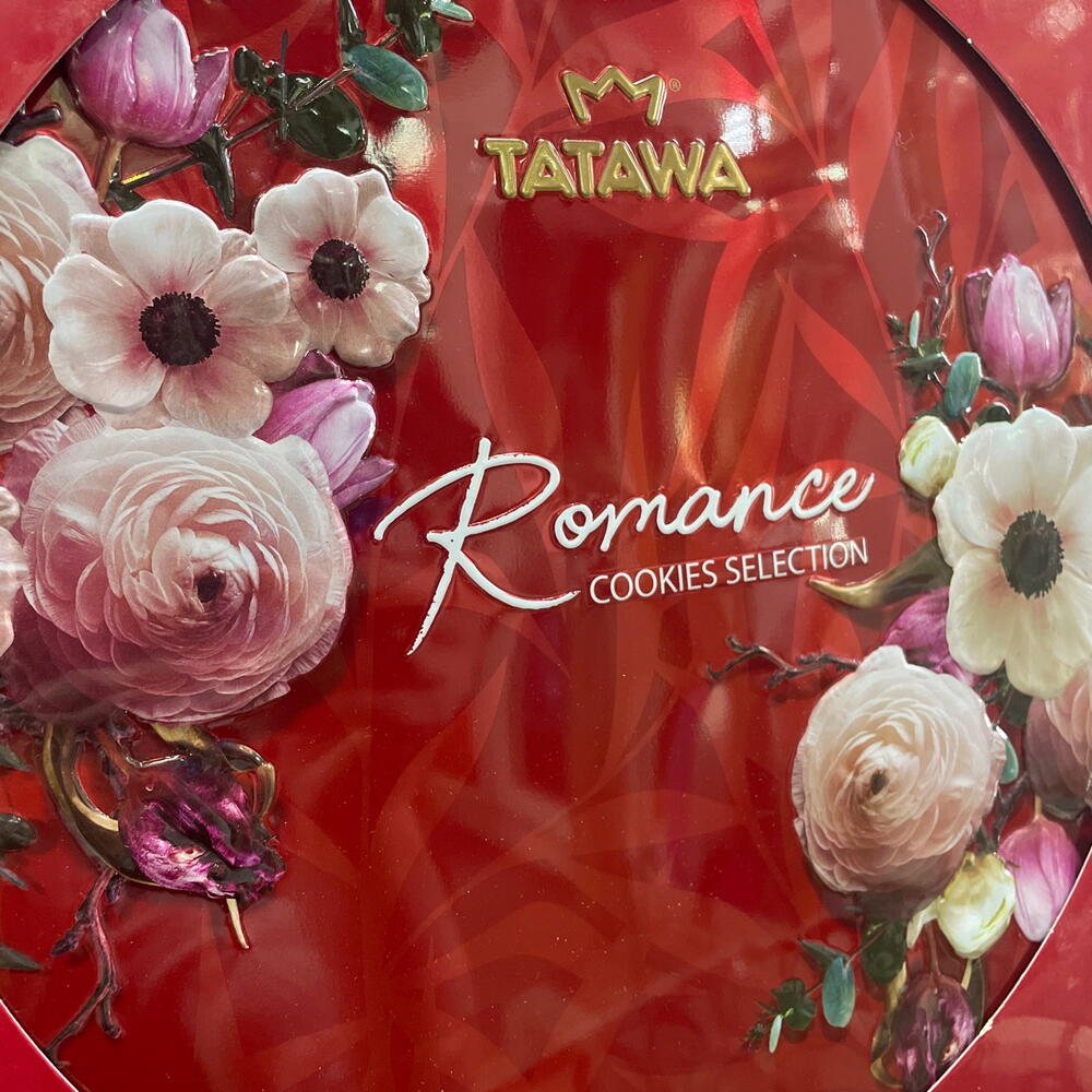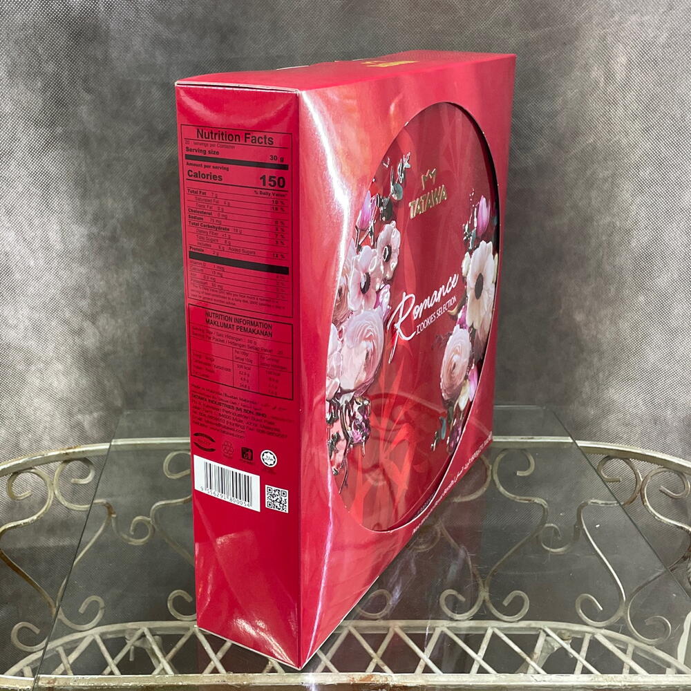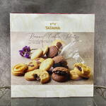 Печенье ассорти в круглой яркой жестяной коробке. На фото представлено в защитной картонной упаковке