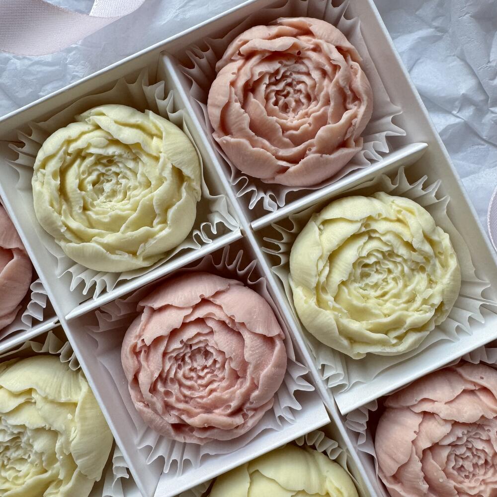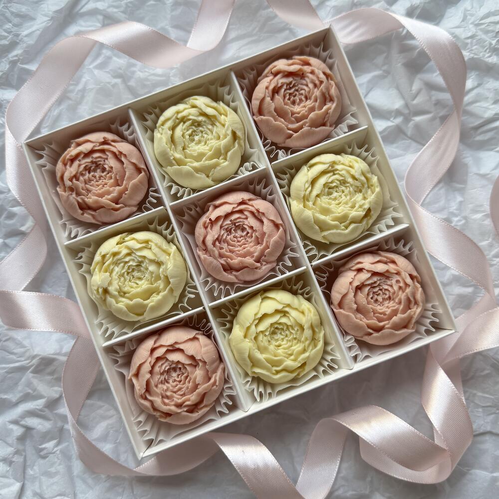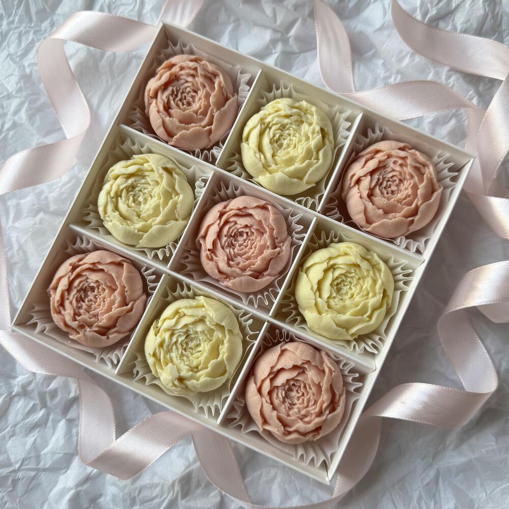 Шоколадные пионы белого и нежно/розового цвета из натурального премиального, очень вкусного бельгийского шоколада Callebaut. Пионы цельные без пустот и добавок. Размер коробочки на 9 пионов 15 на 15 см, высота 3 см.