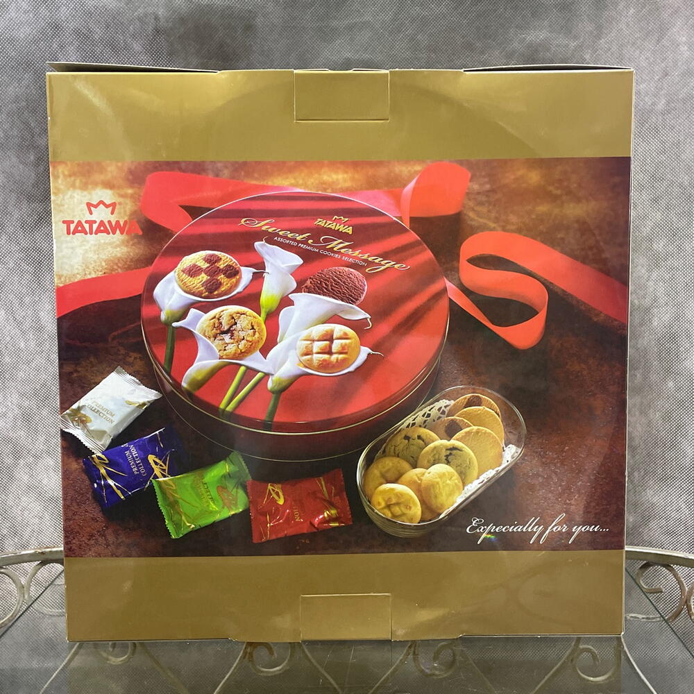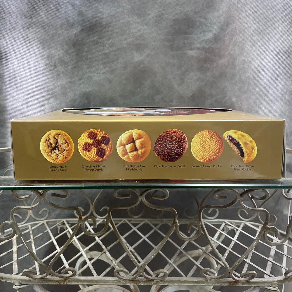 Печенье ассорти в красивой круглой жестяной коробке. На фото представлено в защитной картонной упаковке