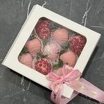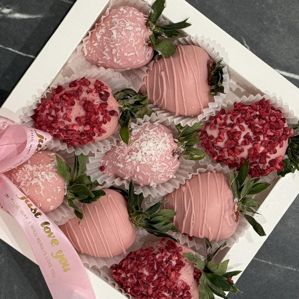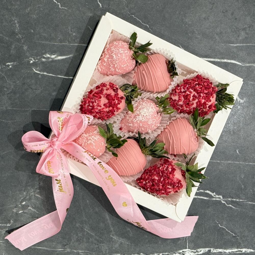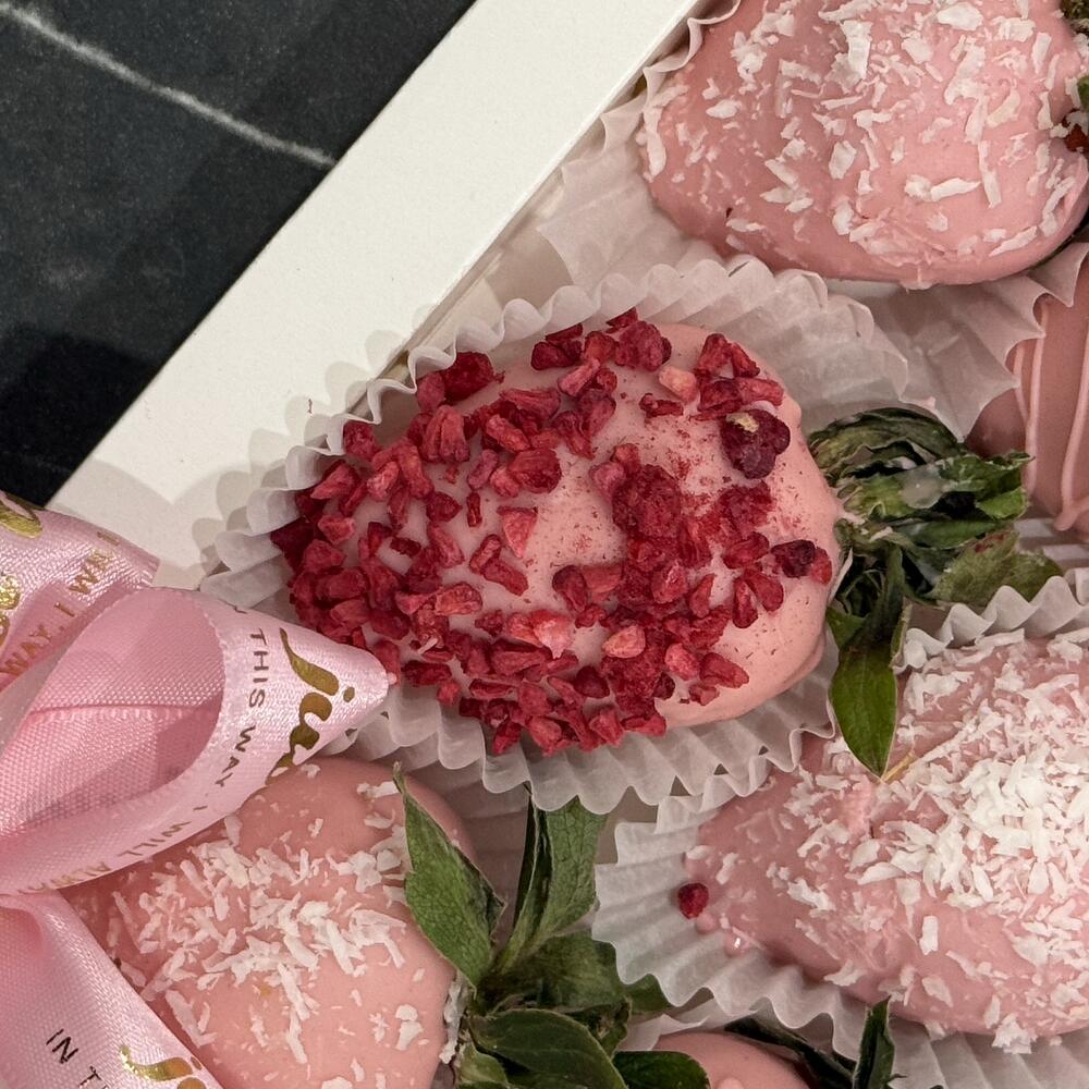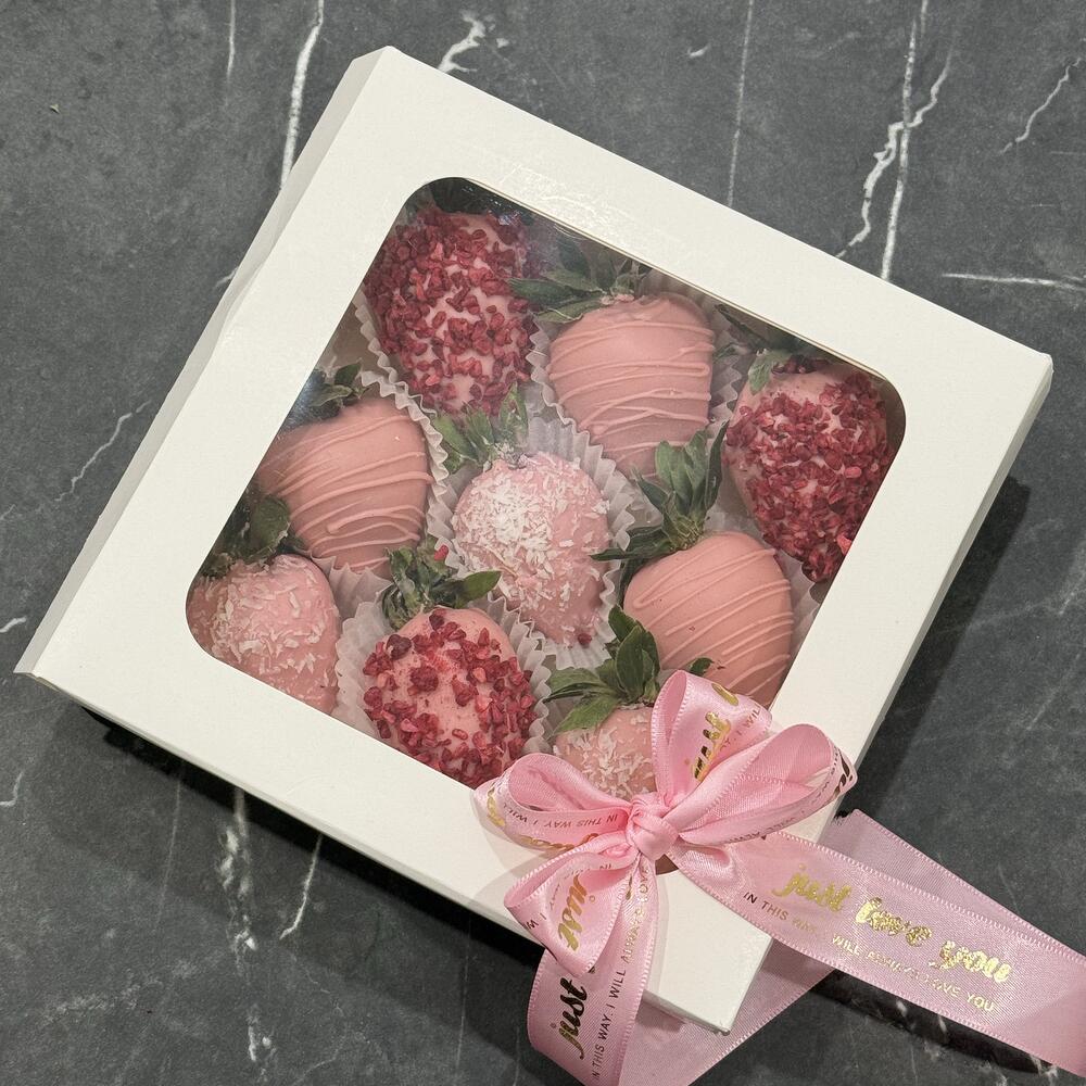 Клубника свежая отборная в бельгийском шоколаде Callebaut шоколад белый (сахар; масло какао; сухое цельное молоко; сухое обезжиренное молоко; молочный жир; эмульгатор лецитин соевый; натуральный ароматизатор: ваниль), Кокосовая стружка Сублимированная малина Коробочка Атласная лента Крафт пакет
